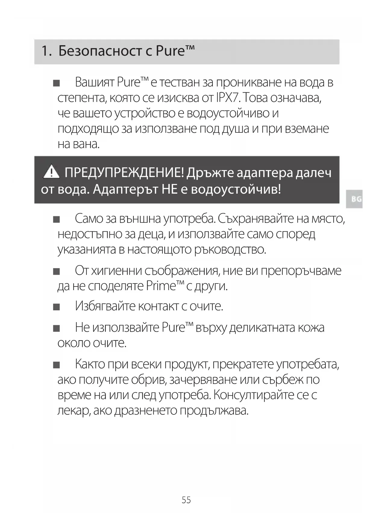 ■ Преди да използвате Pure™ за първи път, моля, прочетете изцяло настоящото ръководство за употреба. Обърнете особено внимание на процедурите за използване и работа с устройството, както и на процедурите, които са необходими след употреба. Преди употреба прочетете всички предупреждения и предпазни мерки, свързани с безопасността, и ги спазвайте стриктно при употреба.