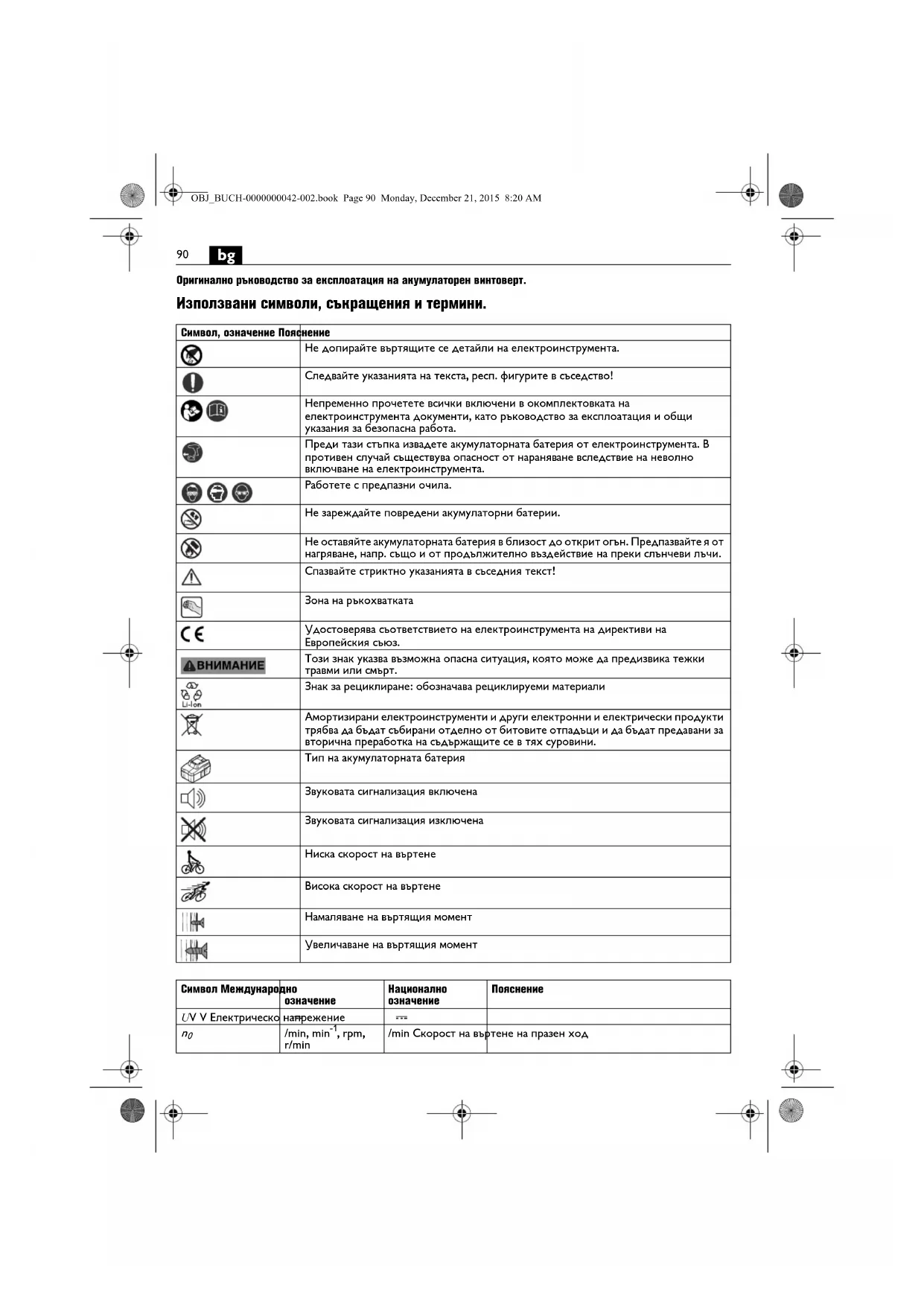 Оригинално ръководство за експлоатация на акумулаторен винтоверт. Използвани символи, съкращения и термини. Символ, означение Пояснение Не допирайте въртящите се детайли на електроинструмента. Следвайте указанията на текста, респ. фигурите в съседство! Непременно прочетете всички включени в окомплектовката на електроинструмента документи, като ръководство за експлоатация и общи указания за безопасна работа. Преди тази стъпка извадете акумулаторната батерия от електроинструмента. В противен случай съществува опасност от нараняване вследствие на неволно включване на електроинструмента. Работете с предпазни очила. Не зареждайте повредени акумулаторни батерии. Не оставяйте акумулаторната батерия в близост до открит огън. Предпазвайте я от нагряване, напр. също и от продължително въздействие на преки слънчеви лъчи. Спазвайте стриктно указанията в съседния текст! Зона на ръкохватката Удостоверява съответствието на електроинструмента на директиви на Европейския съюз. Този знак указва възможна опасна ситуация, която може да предизвика тежки травми или смърт. Знак за рециклиране: обозначава рециклируеми материали Амортизирани електроинструменти и други електронни и електрически продукти трябва да бъдат събирани отделно от битовите отпадъци и да бъдат предавани за вторична преработка на съдържащите се в тях суровини. Тип на акумулаторната батерия Звуковата сигнализация включена Звуковата сигнализация изключена Ниска скорост на въртене Висока скорост на въртене Намаляване на въртящия момент Увеличаване на въртящия момент Символ Международно