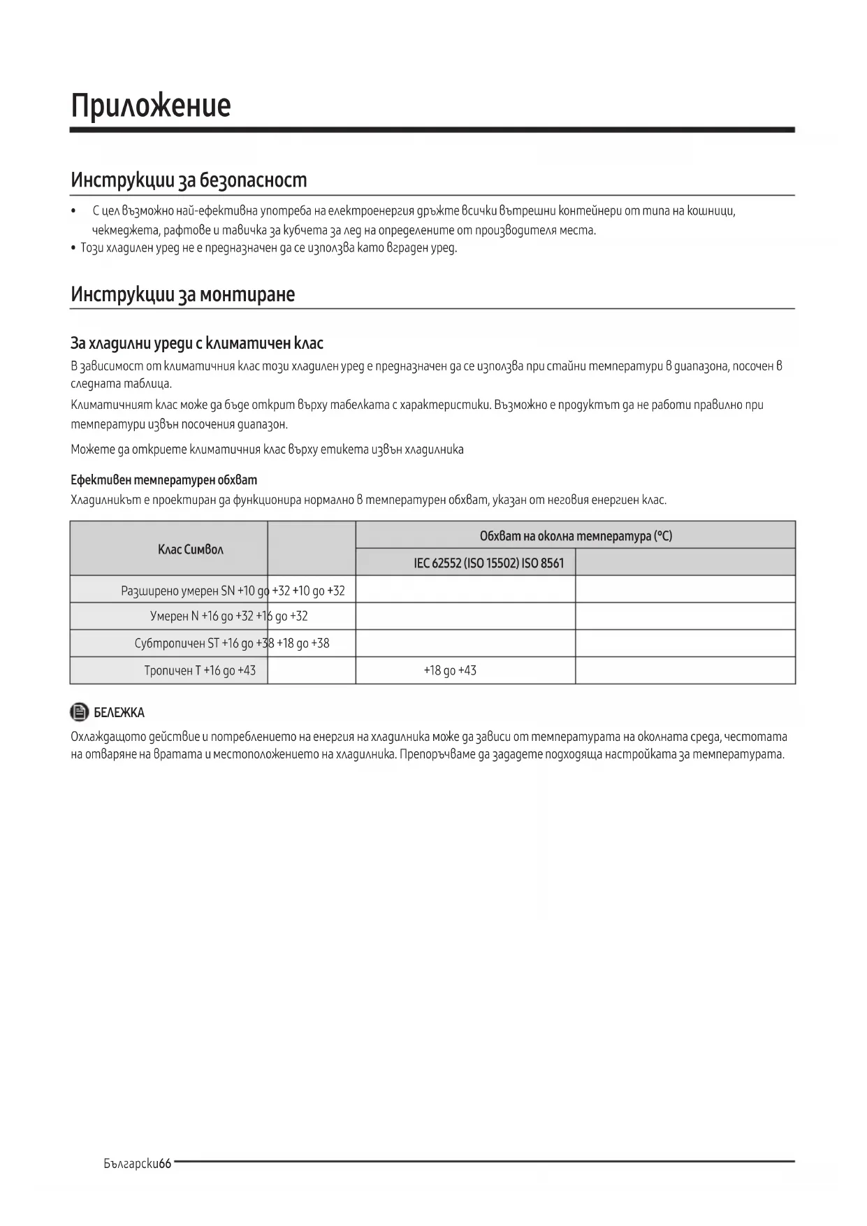 - Този хладилен уред не е предназначен да се използва като вграден уред. Инструкции за монтиране За хладилни уреди с климатичен клас В зависимост от климатичния клас този хладилен уред е предназначен да се използва при стайни температури в диапазона, посочен в следната таблица. Климатичният клас може да бъде открит върху табелката с характеристики. Възможно е продуктът да не работи правилно при температури извън посочения диапазон. Можете да откриете климатичния клас върху етикета извън хладилника Ефективен температурен обхват Хладилникът е проектиран да функционира нормално в температурен обхват, указан от неговия енергиен клас. Клас Символ Обхват на околна температура (°C)