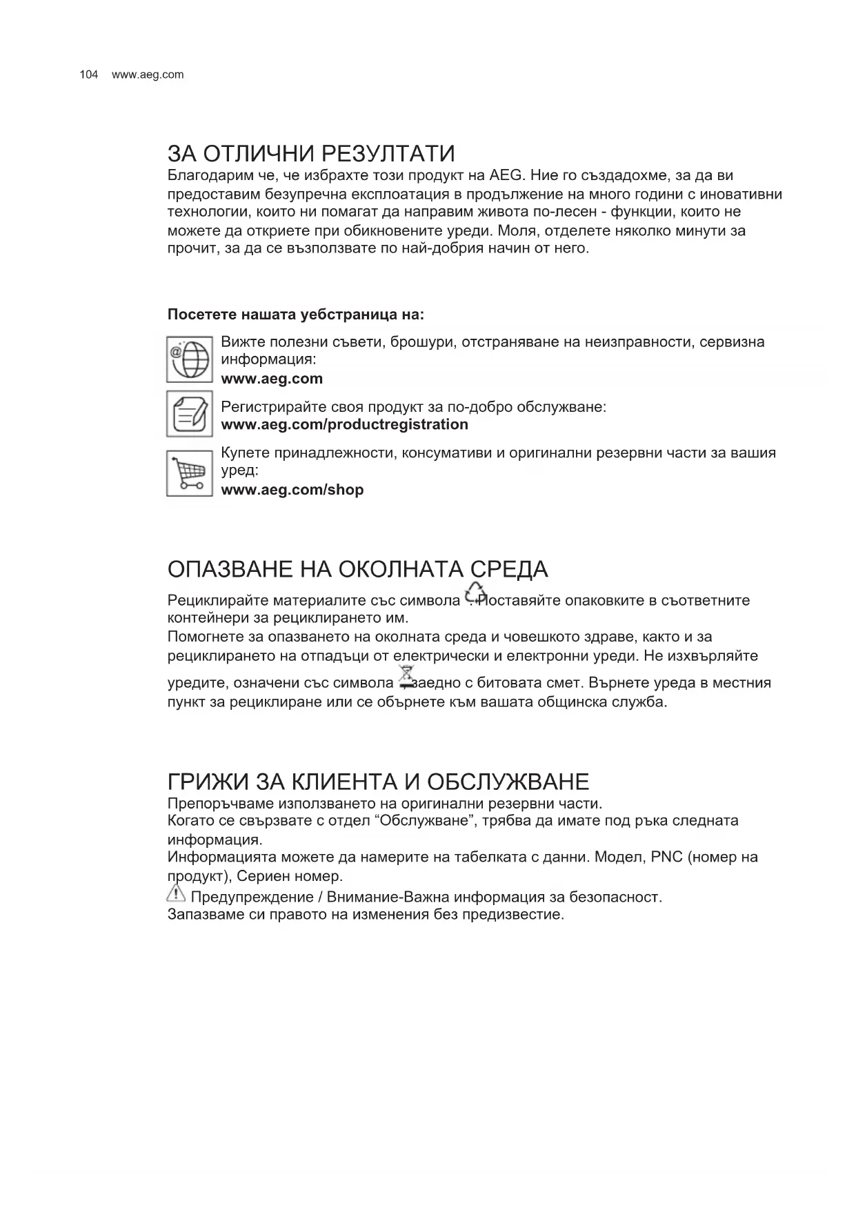 ЗА ОТЛИЧНИ РЕЗУЛТАТИ Благодарим че, че избрахте този продукт на AEG. Ние го създадохме, за да ви предоставим безупречна експлоатация в продължение на много години с иновативни технологии, които ни помагат да направим живота по-лесен - функции, които не можете да откриете при обикновените уреди. Моля, отделете няколко минути за прочит, за да се възползвате по най-добрия начин от него. Посетете нашата уебстраница на: Вижте полезни съвети, брошури, отстраняване на неизправности, сервизна информация: www.aeg.com Регистрирайте своя продукт за по-добро обслужване: www.aeg.com/productregistration Купете принадлежности, консумативи и оригинални резервни части за вашия