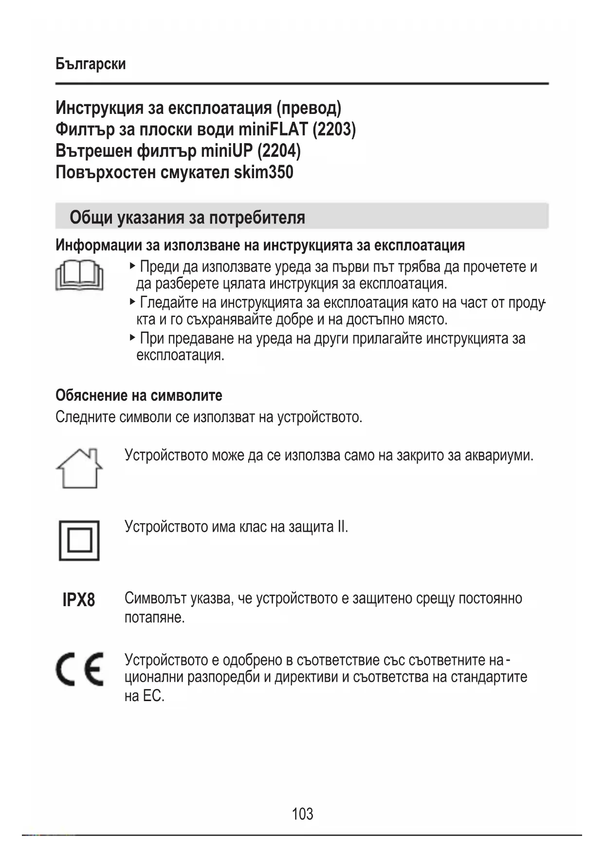 Инструкция за експлоатация (превод) Филтър за плоски води miniFLAT (2203) Вътрешен филтър miniUP (2204) Повърхостен смукател skim350 Общи указания за потребителя Информации за използване на инструкцията за експлоатация ▶ Преди да използвате уреда за първи път трябва да прочетете и да разберете цялата инструкция за експлоатация. ▶ Гледайте на инструкцията за експлоатация като на част от проду