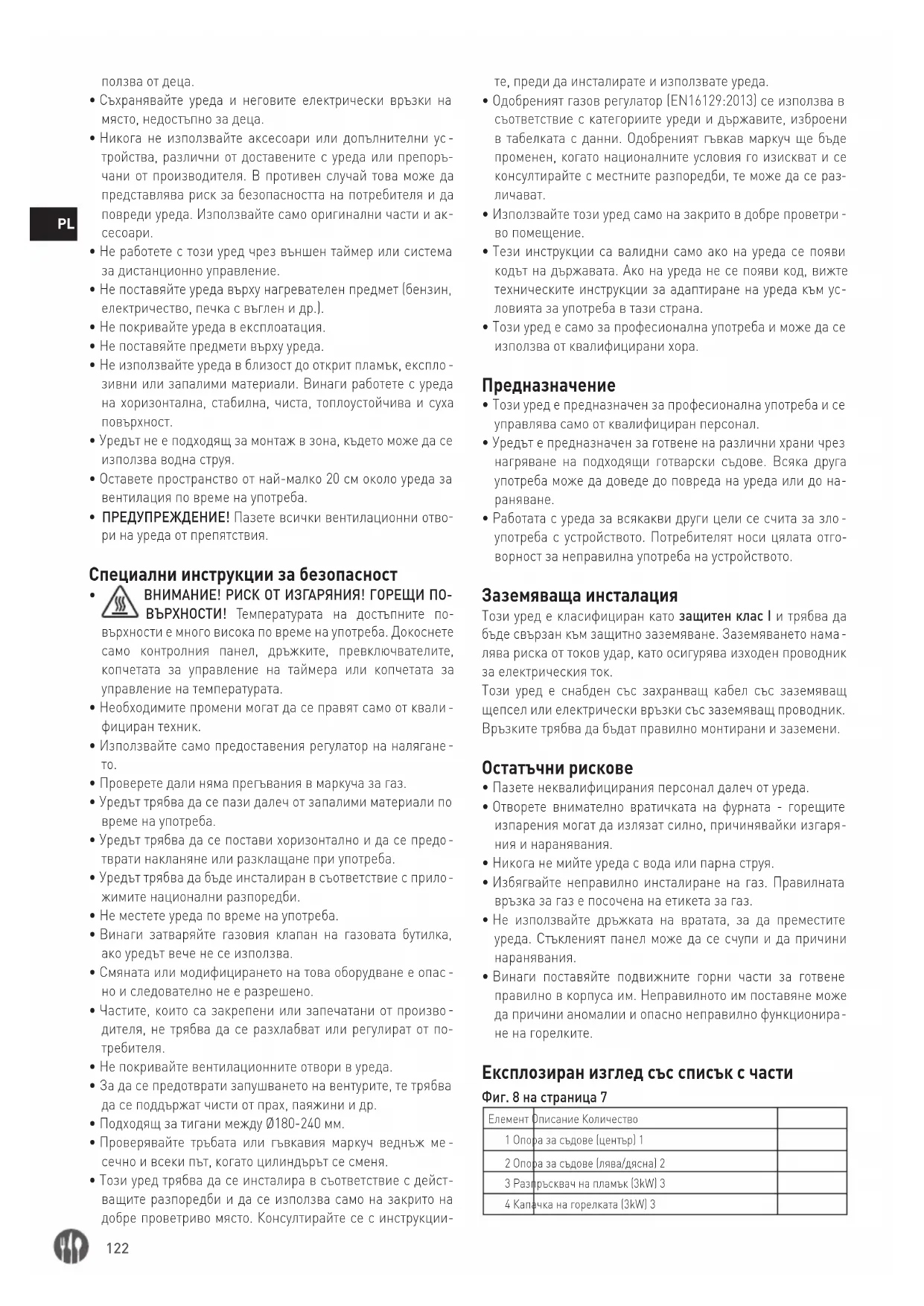 5 Разпръсквач на пламък (1,8kW) 1 6 Капачка на горелката (1,8kW) 1 7 Разпръсквач на пламък (3,5kW) 1 8 Външна капачка на горелката (3,5kW) 1 9 Вътрешна капачка на горелката (3,5kW) 1 10 Горен капак 1 11 Запалителна свещ (настройка) 4 12 Термодвойка 4 13 Ферула (компресиращ пръстен) 5 14 Ядки 5 15 Запалителна свещ (настройка) 1 16 Термодвойка 1 17 Чаша за горелка (3,5kW) 1 18 Гаскет 1 19 Чаша за горелка (3kW) 3 21 Чаша за горелка (1,8kW) 1 22 Адаптер за опора на тигана 1 23 Газова тръба 1 24 Термостат 1 25 Превключвател 1 26 Газов клапан (3kW горелка) 3 27 Газов клапан (3,5kW горелка) 1 28 Газов клапан (1,8kW горелка) 1 29 Таймер 1 30 Клампа 5 31 Дисплейен панел 1 32 Превключвател (искрен модул) 1 33 Копче 5 34 Зелен светлинен капак 1 35 Оранжев светъл капак 1 36 Светлинен индикатор в зелено 1 37 Оранжева индикаторна светлина 1 Фиг. 9 на страница 8 Елемент Описание Количество 1 Заден капак 1 2 Горна скоба 2 3 Странични скоби 4 4 Дясна страна на капака 1 5 Пластина 1 6 Долна плоча 1 7 Крака 4 8 Долен капак 1 9 Долна скоба 2 10 Лява страна на капака 1 Фиг. 10 на страница 9 Елемент Описание Количество 1 Захранващ кабел с облекчение при дърпане 1 2 Спарков модул 1 3 Мотор на вентилатора (завършен) 1 4 Гаскет 2 5 Елемент 230V 1350W 2 6 Държач за елементи 1 7 Гаскет 1 8 Елемент 230V 2500W 1 9 Болт (подпора на протектора) 2 10 Опора на табла *(нов модел) 2 10а Опора на табла от лявата страна *(стар модел) 1 10б Опора на табла от дясната страна *(стар модел) 1 11 Завършена врата *(нов модел) 1 11а Завършена врата *(стар модел) 1 11б Завършена врата *(стар модел) 1 12 Дръжка 1 13 Болт 2 14 Пръст *(нов модел) 2 14а Пръст *(стар модел) 2 15 Стъкло на вратата 1 16 Пералня 2 17 Стъкло на вътрешната врата 1 18 Уплътнение на вратата *(нов модел) 1 18а Уплътнение на вратата *(стар модел) 1 19 Пластина на преградата 1 20 Подглавник 1 21 Превключвател на вратата 1 22 Заземителен болт 1 23 Фитингът на лампата е завършен 2 23а Лампа 15W 2 24 Скоба 1 25 Висок лимит 10 26 Покритие 1 27 Клип 1 28 Монтаж на маркуча за газ 1 Забележка: Съдържанието на това ръководство се отнася за всички изброени елементи, освен ако не е посочено друго. Външният вид може да се различава от показаните илюс