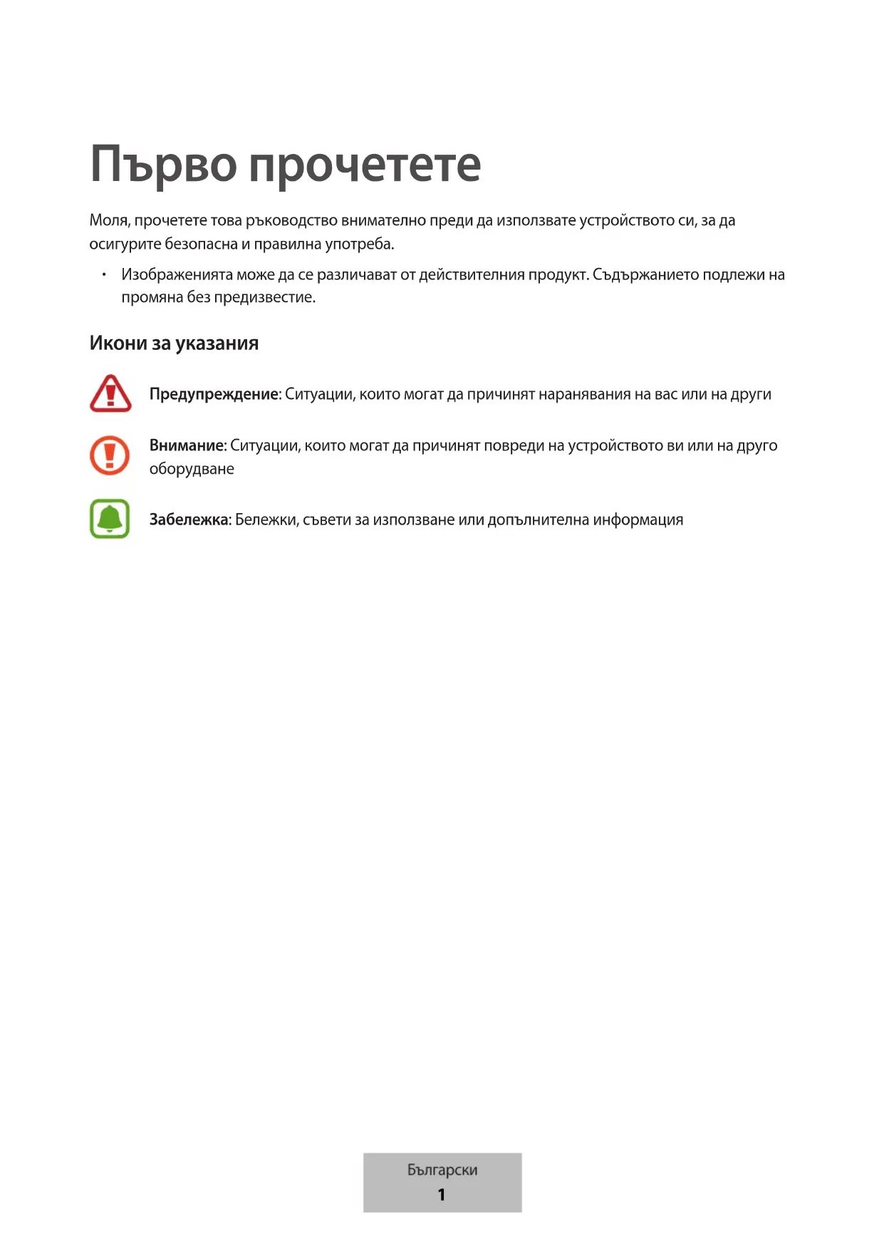 Изображенията може да се различават от действителния продукт. Съдържанието подлежи на промяна без предизвестие. Икони за указания Предупреждение: Ситуации, които могат да причинят наранявания на вас или на други Внимание: Ситуации, които могат да причинят повреди на устройството ви или на друго