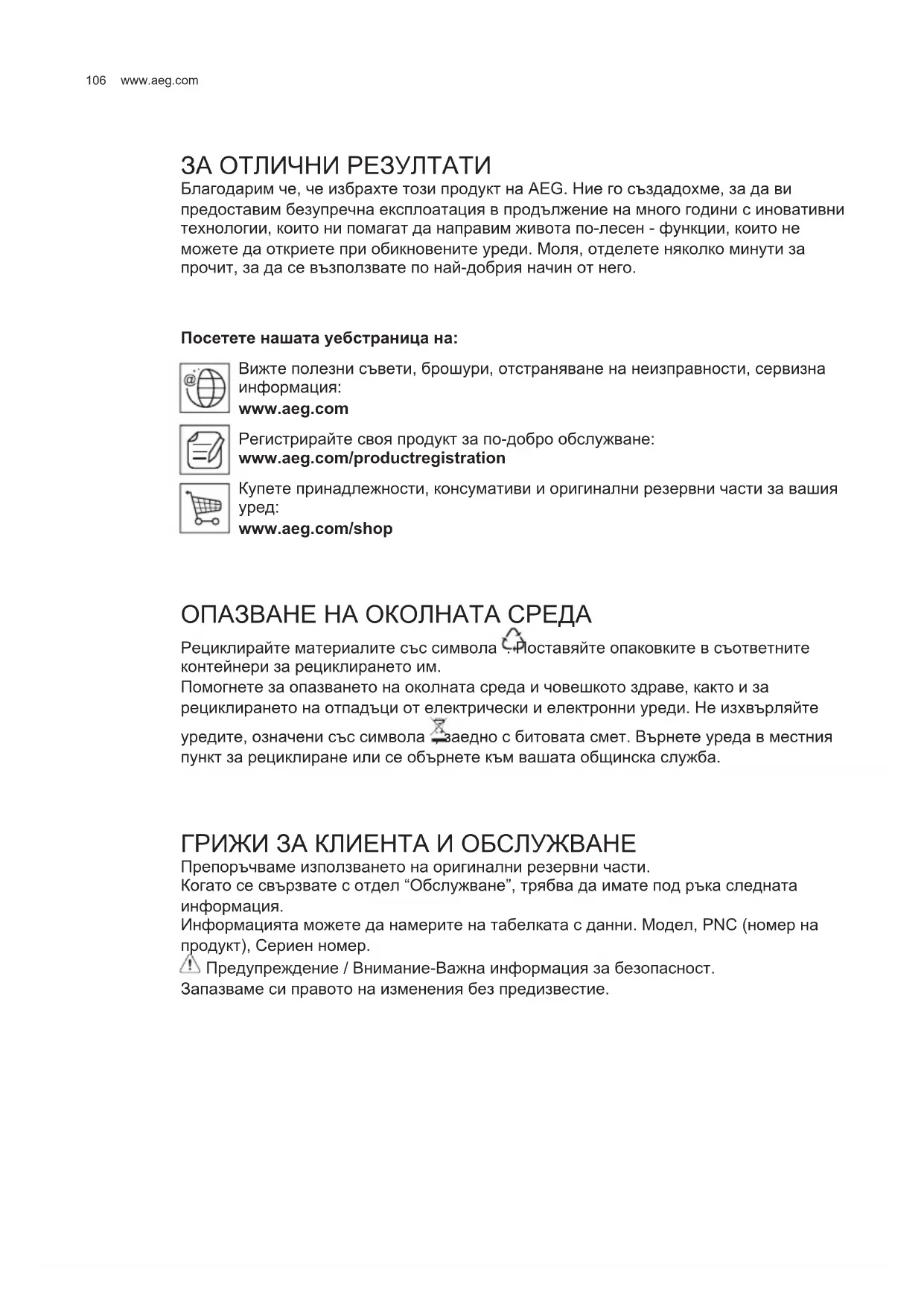 ЗА ОТЛИЧНИ РЕЗУЛТАТИ Благодарим че, че избрахте този продукт на AEG. Ние го създадохме, за да ви предоставим безупречна експлоатация в продължение на много години с иновативни технологии, които ни помагат да направим живота по-лесен - функции, които не можете да откриете при обикновените уреди. Моля, отделете няколко минути за прочит, за да се възползвате по най-добрия начин от него. Посетете нашата уебстраница на: Вижте полезни съвети, брошури, отстраняване на неизправности, сервизна информация: www.aeg.com Регистрирайте своя продукт за по-добро обслужване: www.aeg.com/productregistration Купете принадлежности, консумативи и оригинални резервни части за вашия