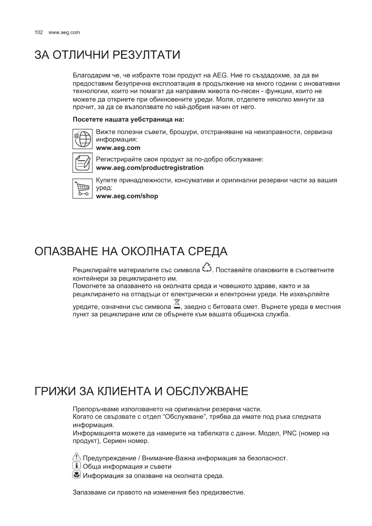 www.aeg.com/shop ОПАЗВАНЕ НА ОКОЛНАТА СРЕДА Рециклирайте материалите със символа . Поставяйте опаковките в съответните контейнери за рециклирането им. Помогнете за опазването на околната среда и човешкото здраве, както и за рециклирането на отпадъци от електрически и електронни уреди. Не изхвърляйте уредите, означени със символа , заедно с битовата смет. Върнете уреда в местния пункт за рециклиране или се обърнете към вашата общинска служба. ГРИЖИ ЗА КЛИЕНТА И ОБСЛУЖВАНЕ Препоръчваме използването на оригинални резервни части. Когато се свързвате с отдел “Обслужване”, трябва да имате под ръка следната информация. Информацията можете да намерите на табелката с данни. Модел, PNC (номер на продукт), Сериен номер. Предупреждение / Внимание-Важна информация за безопасност. Обща информация и съвети Информация за опазване на околната среда. Запазваме си правото на изменения без предизвестие.
