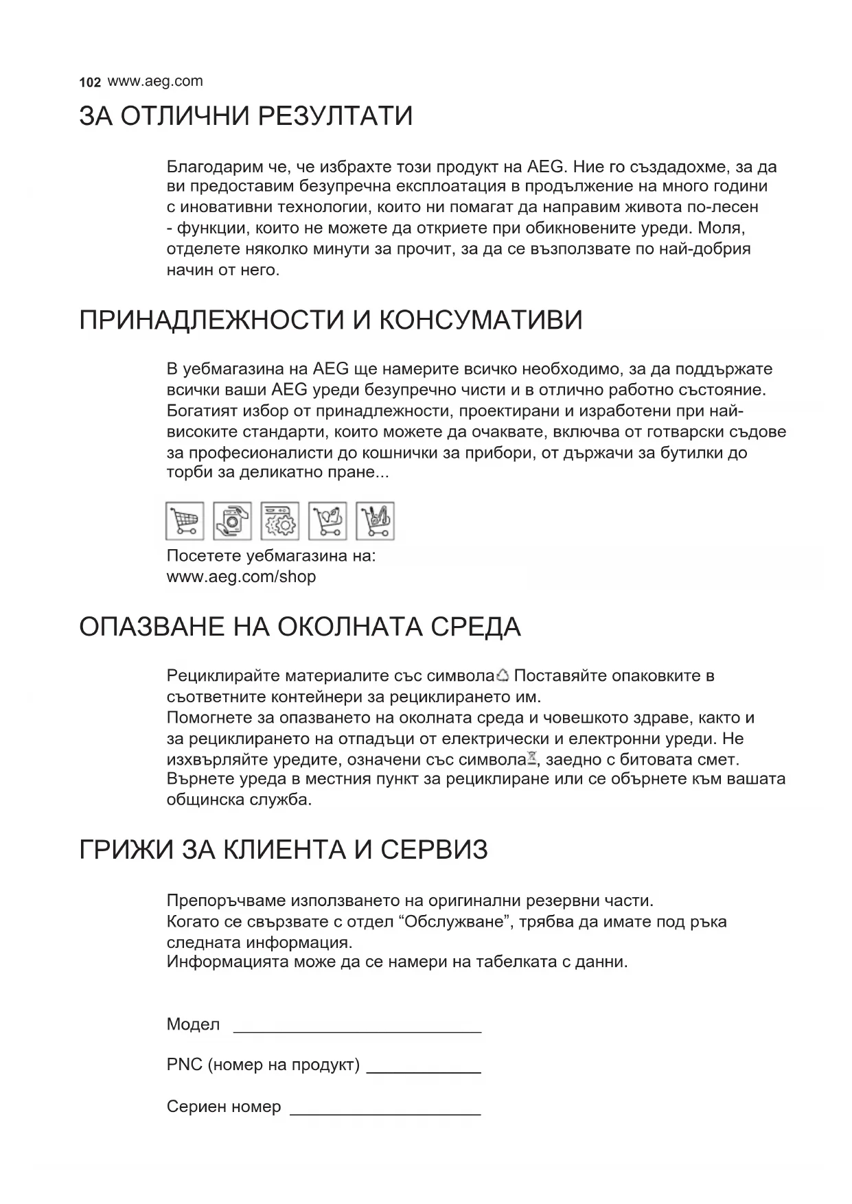 - Değişim için lütfen Teknik Destek’e başvurun (“Satın almak için lütfen teknik desteğe başvurun”).102 www.aeg.com ЗА ОТЛИЧНИ РЕЗУЛТАТИ Благодарим че, че избрахте този продукт на AEG. Ние го създадохме, за да ви предоставим безупречна експлоатация в продължение на много години с иновативни технологии, които ни помагат да направим живота по-лесен - функции, които не можете да откриете при обикновените уреди. Моля, отделете няколко минути за прочит, за да се възползвате по най-добрия начин от него. ПРИНАДЛЕЖНОСТИ И КОНСУМАТИВИ В уебмагазина на AEG ще намерите всичко необходимо, за да поддържате всички ваши AEG уреди безупречно чисти и в отлично работно състояние. Богатият избор от принадлежности, проектирани и изработени при най- високите стандарти, които можете да очаквате, включва от готварски съдове за професионалисти до кошнички за прибори, от държачи за бутилки до торби за деликатно пране... Посетете уебмагазина на: www.aeg.com/shop ОПАЗВАНЕ НА ОКОЛНАТА СРЕДА Рециклирайте материалите със символа . Поставяйте опаковките в съответните контейнери за рециклирането им. Помогнете за опазването на околната среда и човешкото здраве, както и за рециклирането на отпадъци от електрически и електронни уреди. Не изхвърляйте уредите, означени със символа , заедно с битовата смет. Върнете уреда в местния пункт за рециклиране или се обърнете към вашата общинска служба. ГРИЖИ ЗА КЛИЕНТА И СЕРВИЗ Препоръчваме използването на оригинални резервни части. Когато се свързвате с отдел “Обслужване”, трябва да имате под ръка следната информация. Информацията може да се намери на табелката с данни. Модел __________________________ PNC (номер на продукт) ____________ Сериен номер ____________________103 BULGARIAN