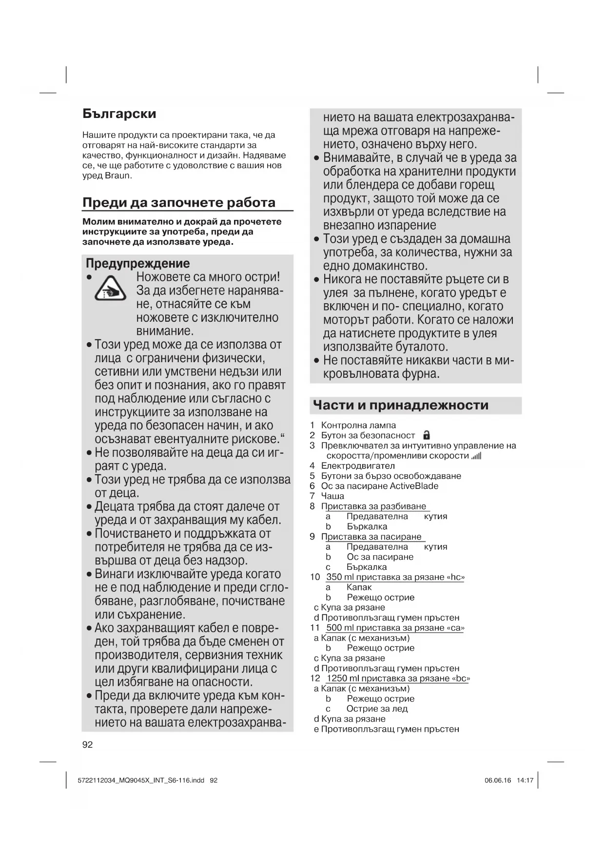 - Когато обработвате хранителни продукти с високо съдържание на пигменти (например моркови), приставките може да се обезцветят. Намажете тези части с растително олио, преди да ги почистите. Проектните спецификации, както и настоящите инструкции за потребителя подлежат на промени без предупреждение. Обект е на промени без предупреждение. Не изхвърляйте продукта заедно с битовите отпадъци в края на неговия експлоатационен срок. Изхвърлянето може да се извърши в Центъра за обслужване на Braun или в съответните пунктове за събиране, предвидени във вашата страна. Материалите и предметите, предназначени за употреба с хранителни продукти, отговарят на предписанията на Европейски регламент 1935/2004. 5722112034_MQ9045X_INT_S6-116.indd 965722112034_MQ9045X_INT_S6-116.indd 96 06.06.16 14:1706.06.16 14:1797