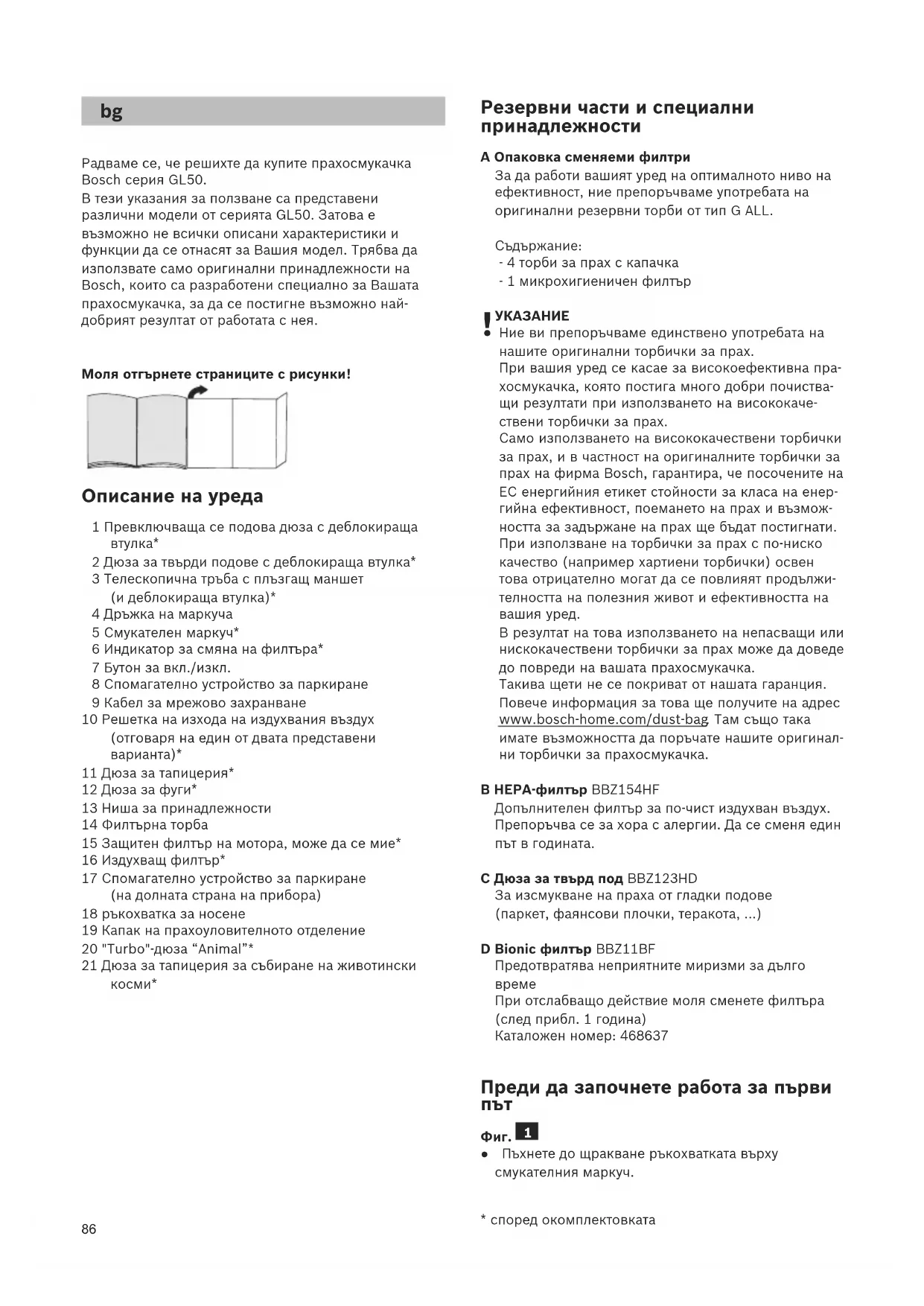 Ние ви препоръчваме единствено употребата на нашите оригинални торбички за прах. При вашия уред се касае за високоефективна пра- хосмукачка, която постига много добри почиства- щи резултати при използването на висококаче- ствени торбички за прах. Само използването на висококачествени торбички за прах, и в частност на оригиналните торбички за прах на фирма Bosch, гарантира, че посочените на ЕС енергийния етикет стойности за класа на енер- гийна ефективност, поемането на прах и възмож- ността за задържане на прах ще бъдат постигнати. При използване на торбички за прах с по-ниско качество (например хартиени торбички) освен това отрицателно могат да се повлияят продължи- телността на полезния живот и ефективността на вашия уред. В резултат на това използването на непасващи или нискокачествени торбички за прах може да доведе до повреди на вашата прахосмукачка. Такива щети не се покриват от нашата гаранция. Повече информация за това ще получите на адрес www.bosch-home.com/dust-bag . Там също така имате възможността да поръчате нашите оригинал- ни торбички за прахосмукачка. B HEPA-филтър BBZ154HF Допълнителен филтър за по-чист издухван въздух. Препоръчва се за хора с алергии. Да се сменя един път в годината. C Дюза за твърд под BBZ123HD За изсмукване на праха от гладки подове (паркет, фаянсови плочки, теракота, ...) D Bionic филтър BBZ11BF Предотвратява неприятните миризми за дълго