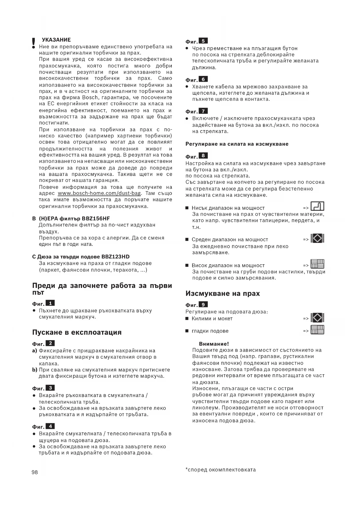 възможността за задържане на прах ще бъдат постигнати. При използване на торбички за прах с по- ниско качество (например хартиени торбички) освен това отрицателно могат д а се повлияят продължителността на полезния живот и ефективността на вашия уред. В резултат на това използването на непасващи или нискокачествени торбички за прах може д а доведе до повреди на вашата прахосмукачка. Такива щети не се покриват от нашата гаранция. Повече информация за това ще получите на адрес www.bosch-home.com/dust-bag. Там също