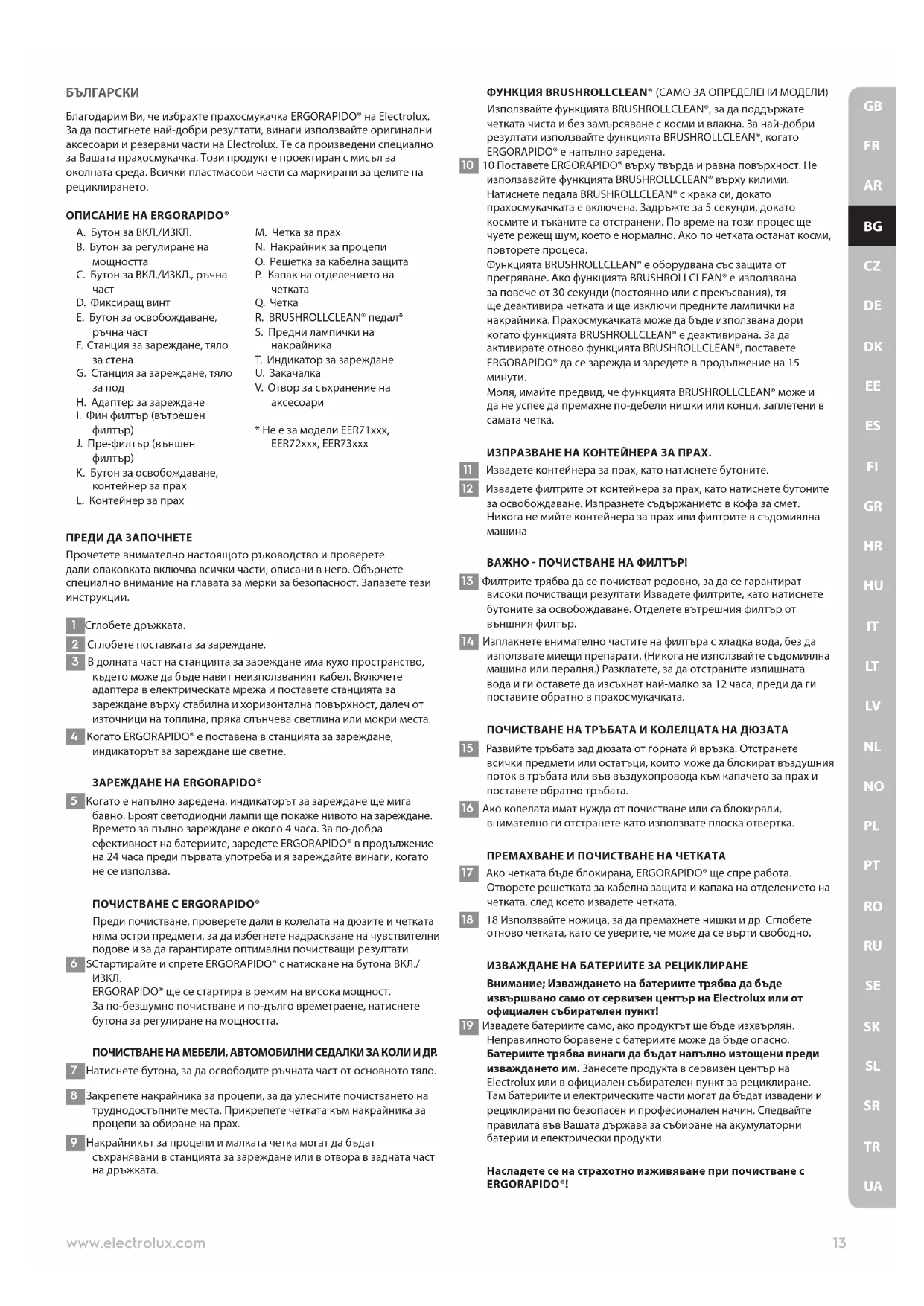- Не е за модели EER71xxx, EER72xxx, EER73xxx ПРЕДИ ДА ЗАПОЧНЕТЕ Прочетете внимателно настоящото ръководство и проверете дали опаковката включва всички части, описани в него. Обърнете специално внимание на главата за мерки за безопасност. Запазете тези инструкции. 1 Сглобете дръжката. 2 Сглобете поставката за зареждане. 3 В долната част на станцията за зареждане има кухо пространство, където може да бъде навит неизползваният кабел. Включете адаптера в електрическата мрежа и поставете станцията за зареждане върху стабилна и хоризонтална повърхност, далеч от източници на топлина, пряка слънчева светлина или мокри места. 4 Когато ERGORAPIDO® е поставена в станцията за зареждане, индикаторът за зареждане ще светне. ЗАРЕЖДАНЕ НА ERGORAPIDO® 5 Когато е напълно заредена, индикаторът за зареждане ще мига бавно. Броят светодиодни лампи ще покаже нивото на зареждане. Времето за пълно зареждане е около 4 часа. За по-добра ефективност на батериите, заредете ERGORAPIDO® в продължение на 24 часа преди първата употреба и я зареждайте винаги, когато не се използва. ПОЧИСТВАНЕ С ERGORAPIDO® Преди почистване, проверете дали в колелата на дюзите и четката няма остри предмети, за да избегнете надраскване на чувствителни подове и за да гарантирате оптимални почистващи резултати. 6 SСтартирайте и спрете ERGORAPIDO® с натискане на бутона ВКЛ./
