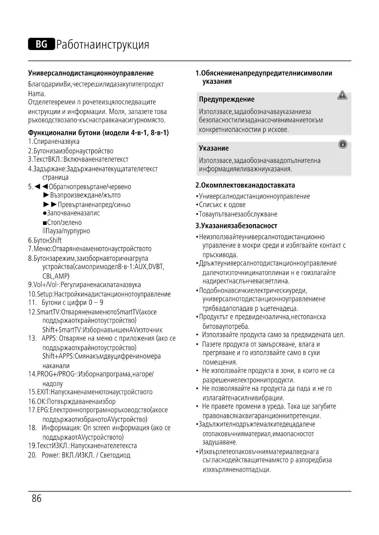 - Подобно на всички електрически уреди, универсалното дистанционно управление не трябва да попада връцете на деца.