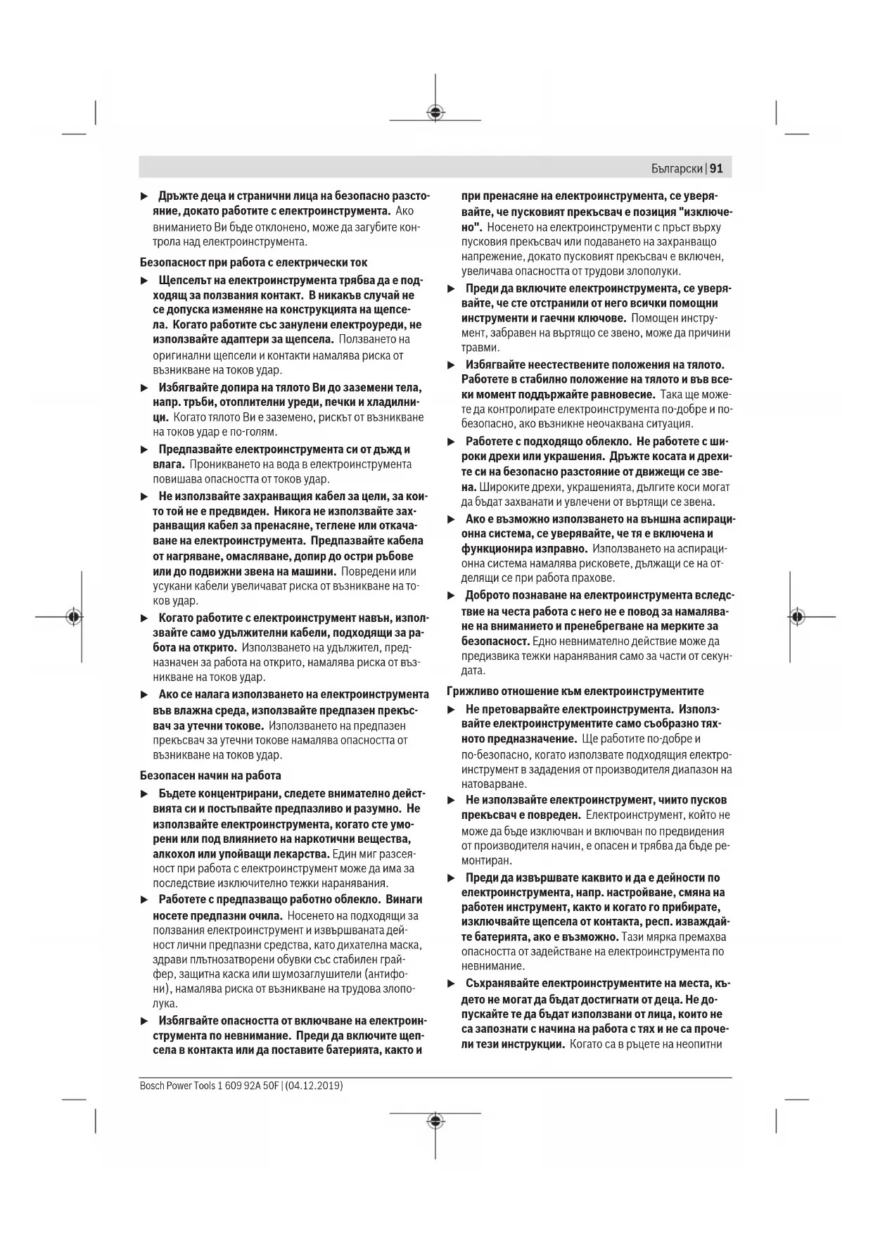 Безопасност на работното място u Пазете работното си място чисто и добре осветено. Разхвърляните или тъмни работни места са предпос- тавка за инциденти. u Не работете с електроинструмента в среда с пови- шена опасност от възникване на експлозия, в бли- зост до леснозапалими течности, газове или прахо- образни материали. По време на работа в електроин- струментите се отделят искри, които могат да възпла- менят прахообразни материали или пари. 1 609 92A 50F | (04.12.2019) Bosch Power ToolsБългарски | 91 u Дръжте деца и странични лица на безопасно разсто- яние, докато работите с електроинструмента. Ако вниманието Ви бъде отклонено, може да загубите кон- трола над електроинструмента. Безопасност при работа с електрически ток u Щепселът на електроинструмента трябва да е под- ходящ за ползвания контакт. В никакъв случай не се допуска изменяне на конструкцията на щепсе- ла. Когато работите със занулени електроуреди, не използвайте адаптери за щепсела. Ползването на оригинални щепсели и контакти намалява риска от възникване на токов удар. u Избягвайте допира на тялото Ви до заземени тела, напр. тръби, отоплителни уреди, печки и хладилни- ци. Когато тялото Ви е заземено, рискът от възникване на токов удар е по‑голям. u Предпазвайте електроинструмента си от дъжд и влага. Проникването на вода в електроинструмента повишава опасността от токов удар. u Не използвайте захранващия кабел за цели, за кои- то той не е предвиден. Никога не използвайте зах- ранващия кабел за пренасяне, теглене или откача- ване на електроинструмента. Предпазвайте кабела от нагряване, омасляване, допир до остри ръбове или до подвижни звена на машини. Повредени или усукани кабели увеличават риска от възникване на то-