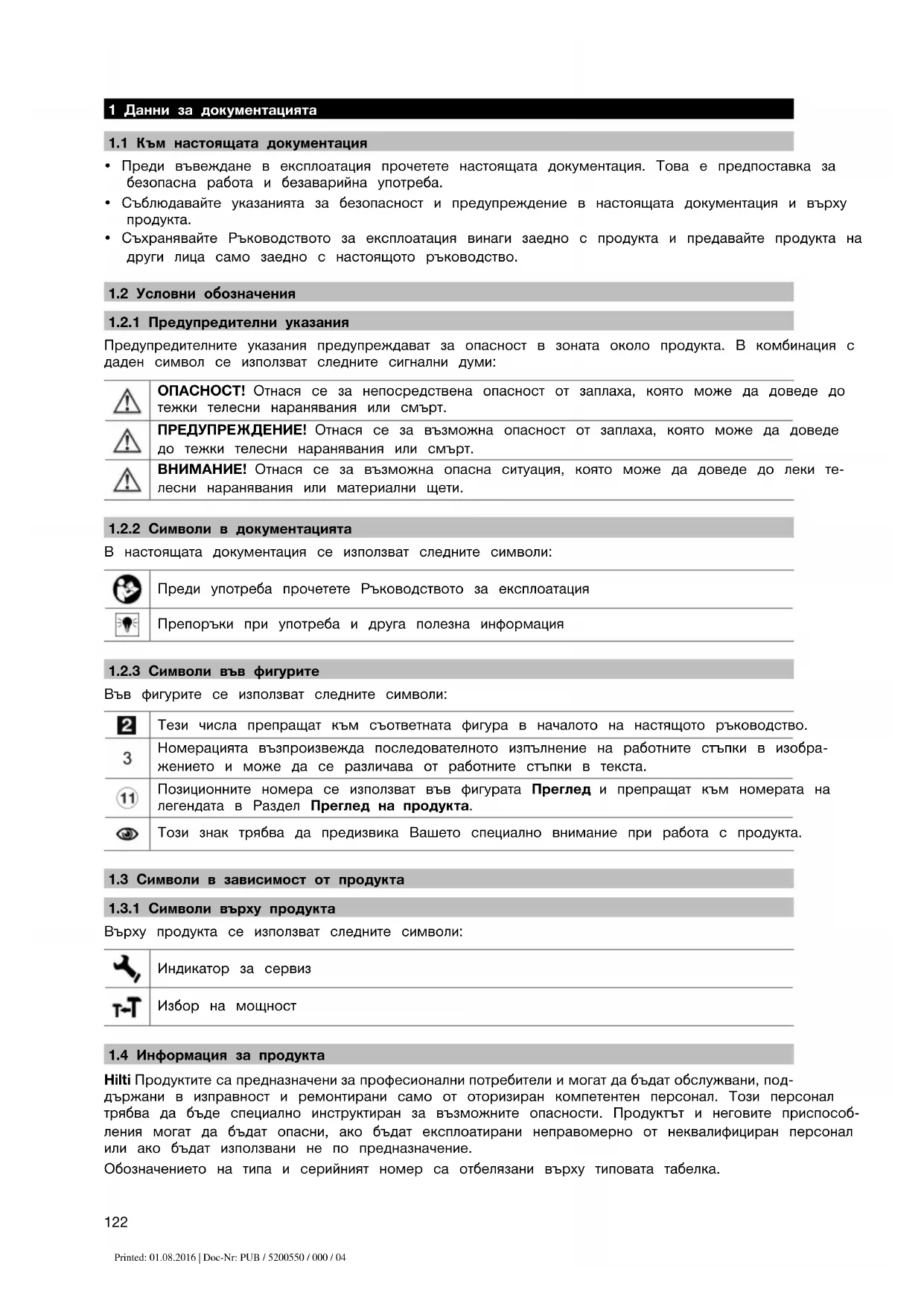 Декларираме на собствена отговорност, че описаният тук продукт отговаря на действащите директиви и стандарти. Копие на Декларацията за съответствие ще намерите в края настоящата документация. Тук се съхранява Техническата документация: Hilti Entwicklungsgesellschaft mbH | Zulassung Werkzeuge | Hiltistraße 6 | 86916 Kaufering, DE 2 Безопасност
