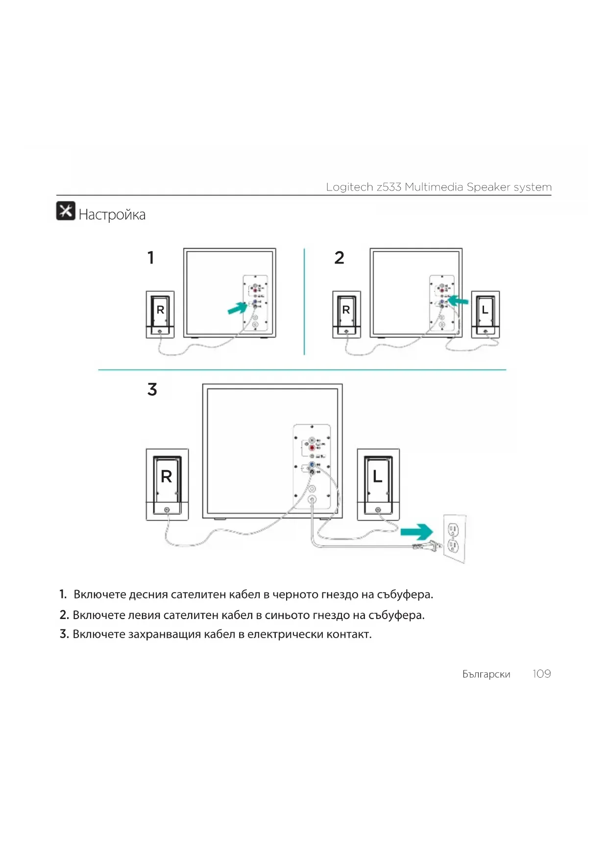 3. Включете захранващия кабел в електрически контакт.Logitech z533 Multimedia Speaker system