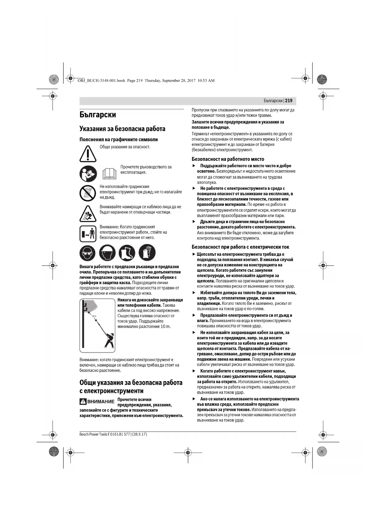 За да бъде гарантирано безопасно работно състояние на градинския инструмент, се уверявайте, че всички гайки, щифтове и винтове са затегнати. OBJ_BUCH-3148-001.book Page 223 Thursday, September 28, 2017 10:53 AM224 | Български F 016 L81 577 | (28.9.17) Bosch Power Tools Уверявайте се, че резервните части, които поставяте, са произведени от Бош. Преди ползване и преди прибиране за съхранение винаги смазвайте меча с ножовете със спрей.