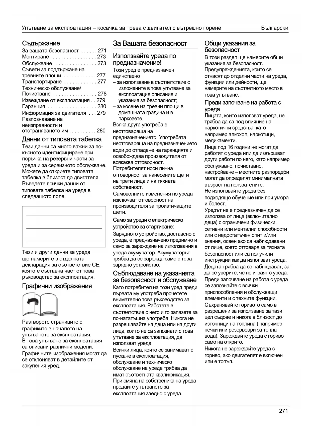 Символи върху уреда Върху уреда ще намерите различни стикери със символи. Следва обяснение на символите:Внимание Преди пускане експлоатация прочетете упътването за експлоатация! Пазете други хора далеч от обсега на действие на уреда!Изключете двигателя и извадете ключа за запалването преди да извършвате някакви работи по уреда и преди да го напуснете.Спазвайте допълнителните указания от глава «За Вашата безопасност».Преди работа по режещите механизми изтеглете лулата на запалителната свещ! Пазете пръстите и краката си далеч от режещите инструменти! Преди регулиране или почистване на уреда, или преди проверка изключете уреда и изтеглете лулата запалителната свещ.Опасност от наранявания – работете само с монтиран предпазител.Опасност от нараняване – работете само с монтирана задна скоба.Опасност от нараняване – работете само с монтиран отвор за изхвърляне.Поддържайте тези символи на уреда винаги в състояние, в което да могат да се четат!Сменете символите, които са повредени или са станали нечетливи. Символи в ръководството В това ръководство се използват символи, които показват опасности или обозначават важни указания. Следва обяснение на символите: