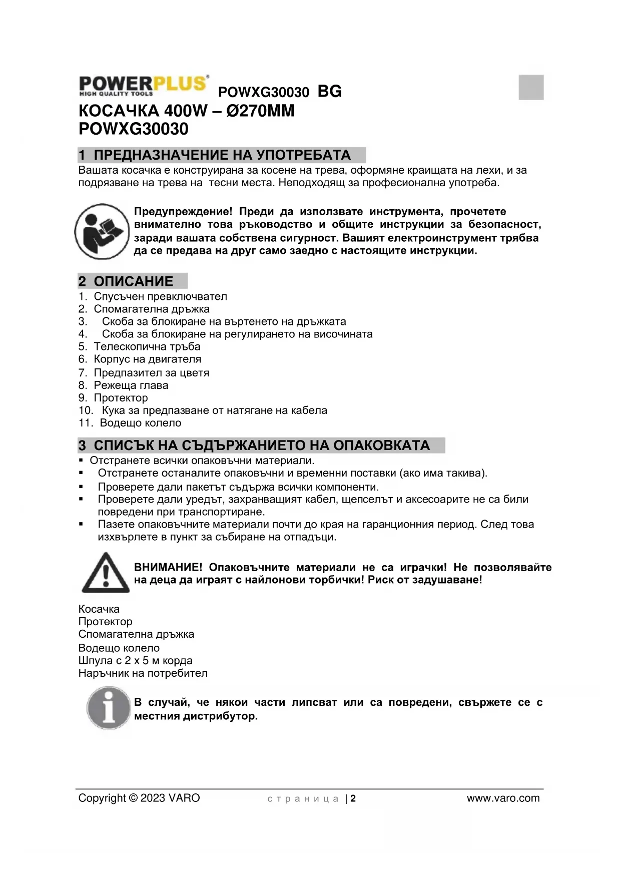 - 17 ДЕКЛАРАЦИЯ ЗА СЪОТВЕТСТВИЕ POWXG30030 BG Copyright © 2023 VARO с т р а н и ц а | 2 www.varo.com КОСАЧКА 400W – Ø270MM POWXG30030 1 ПРЕДНАЗНАЧЕНИЕ НА УПОТРЕБАТА Вашата косачка е конструирана за косене на трева, оформяне краищата на лехи, и за подрязване на трева на тесни места. Неподходящ за професионална употреба. Предупреждение! Преди да използвате инструмента, прочетете внимателно това ръководство и общите инструкции за безопасност, заради вашата собствена сигурност. Вашият електроинструмент трябва да се предава на друг само заедно с настоящите инструкции. 2 ОПИСАНИЕ p. 11
