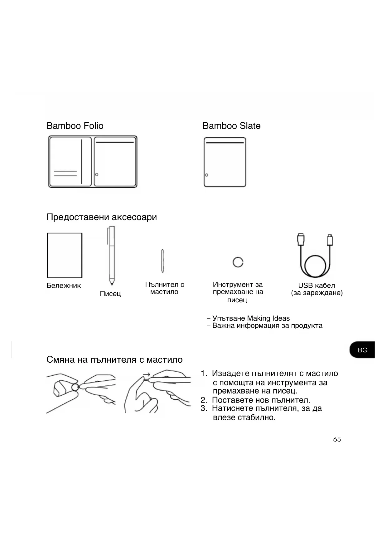 Bamboo Folio Предоставени аксесоари Смяна на пълнителя с мастило – Упътване Making Ideas – Важна информация за продукта