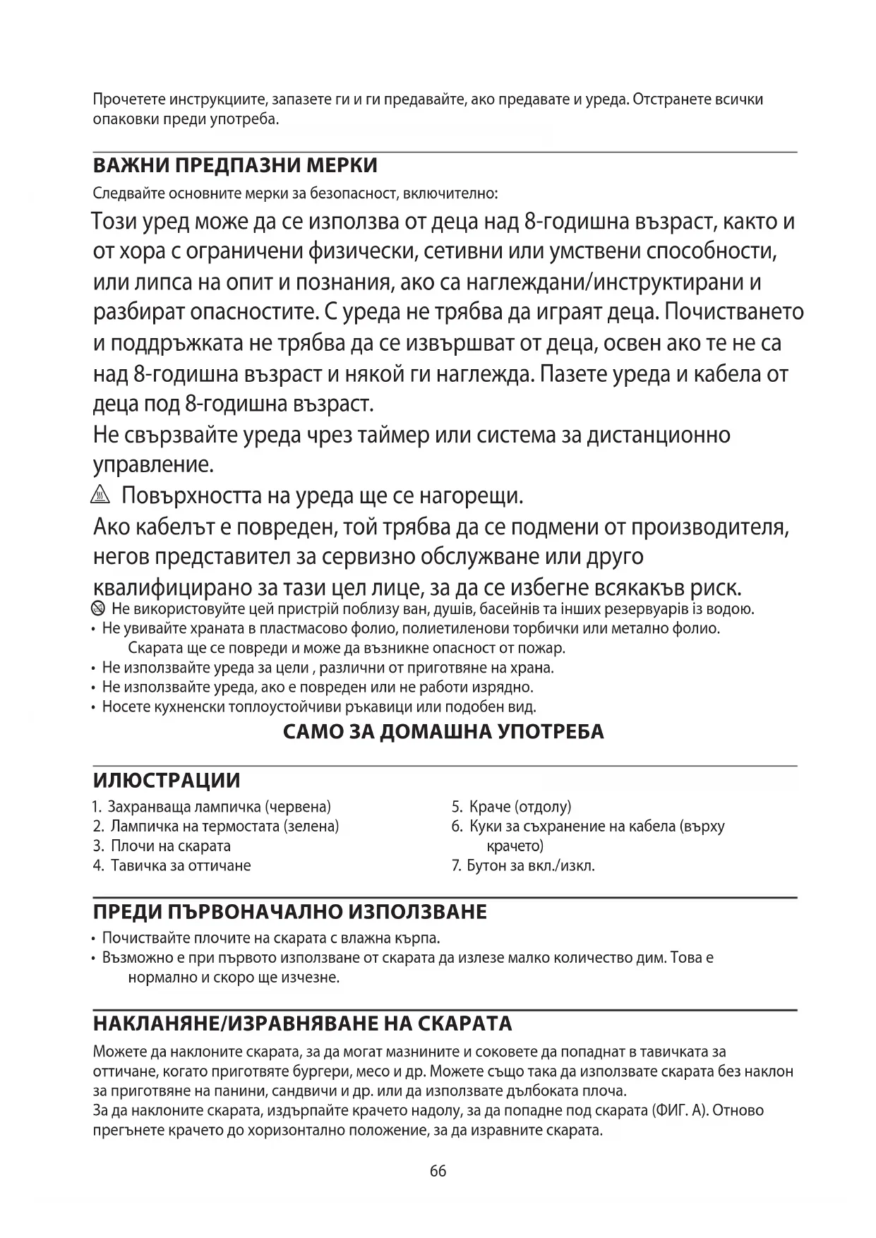 AE66 Прочетете инструкциите, запазете ги и ги предавайте, ако предавате и уреда. Отстранете всички опаковки преди употреба. ВАЖНИ ПРЕДПАЗНИ МЕРКИ Следвайте основните мерки за безопасност, включително: Този уред може да се използва от деца над 8-годишна възраст, както и от хора с ограничени физически, сетивни или умствени способности, или липса на опит и познания, ако са наглеждани/инструктирани и разбират опасностите. С уреда не трябва да играят деца. Почистването и поддръжката не трябва да се извършват от деца, освен ако те не са над 8-годишна възраст и някой ги наглежда. Пазете уреда и кабела от деца под 8-годишна възраст. Не свързвайте уреда чрез таймер или система за дистанционно управление. ¬ Повърхността на уреда ще се нагорещи. Ако кабелът е повреден, той трябва да се подмени от производителя, негов представител за сервизно обслужване или друго квалифицирано за тази цел лице, за да се избегне всякакъв риск. b Не використовуйте цей пристрій поблизу ван, душів, басейнів та інших резервуарів із водою.