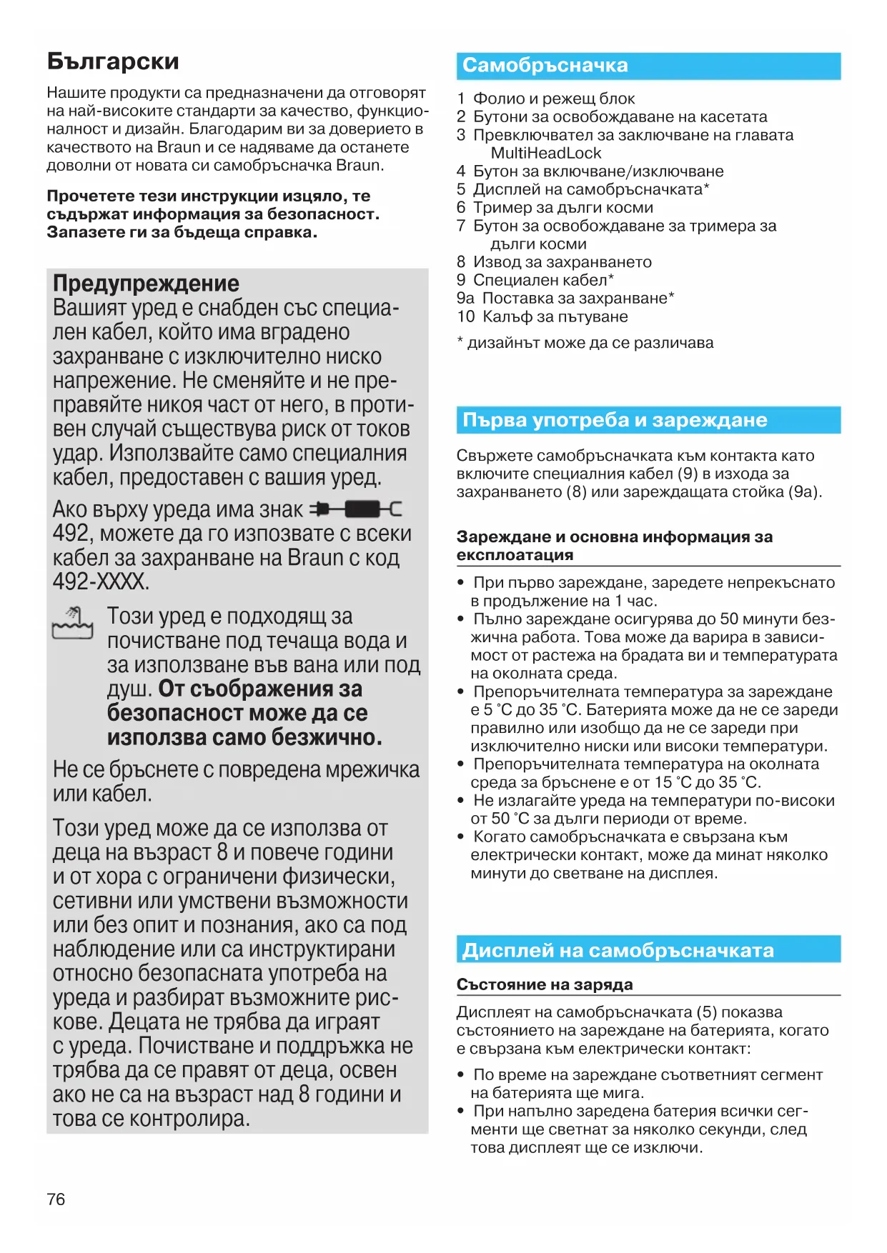 Нашите продукти са предназначени да отговорят на най-високите стандарти за качество, функцио- налност и дизайн. Благодарим ви за доверието в качеството на Braun и се надяваме да останете доволни от новата си самобръсначка Braun. Прочетете тези инструкции изцяло, те съдържат информация за безопасност. Запазете ги за бъдеща справка. Предупреждение Вашият уред е снабден със специа- лен кабел, който има вградено захранване с изключително ниско напрежение. Не сменяйте и не пре- правяйте никоя част от него, в проти- вен случай съществува риск от токов удар. Използвайте само специалния кабел, предоставен с вашия уред. Ако върху уреда има знак 492, можете да го изпозвате с всеки кабел за захранване на Braun с код 492-ХХХХ. Този уред е подходящ за почистване под течаща вода и за използване във вана или под душ. От съображения за безопасност може да се използва само безжично. Не се бръснете с повредена мрежичка