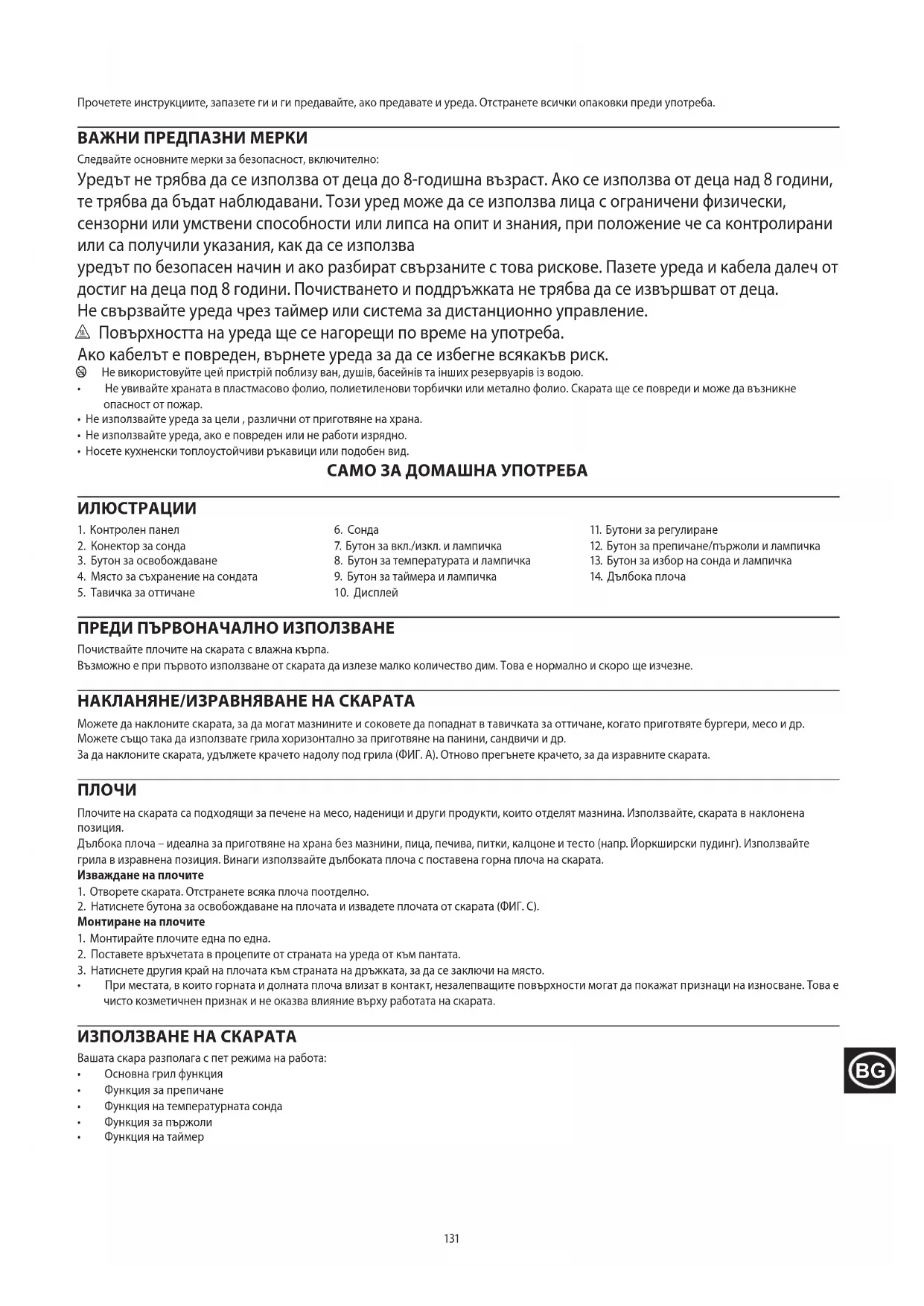 - При местата, в които горната и долната плоча влизат в контакт, незалепващите повърхности могат да покажат признаци на износване. Това е чисто козметичнен признак и не оказва влияние върху работата на скарата. ИЗПОЛЗВАНЕ НА СКАРАТА Вашата скара разполага с пет режима на работа: