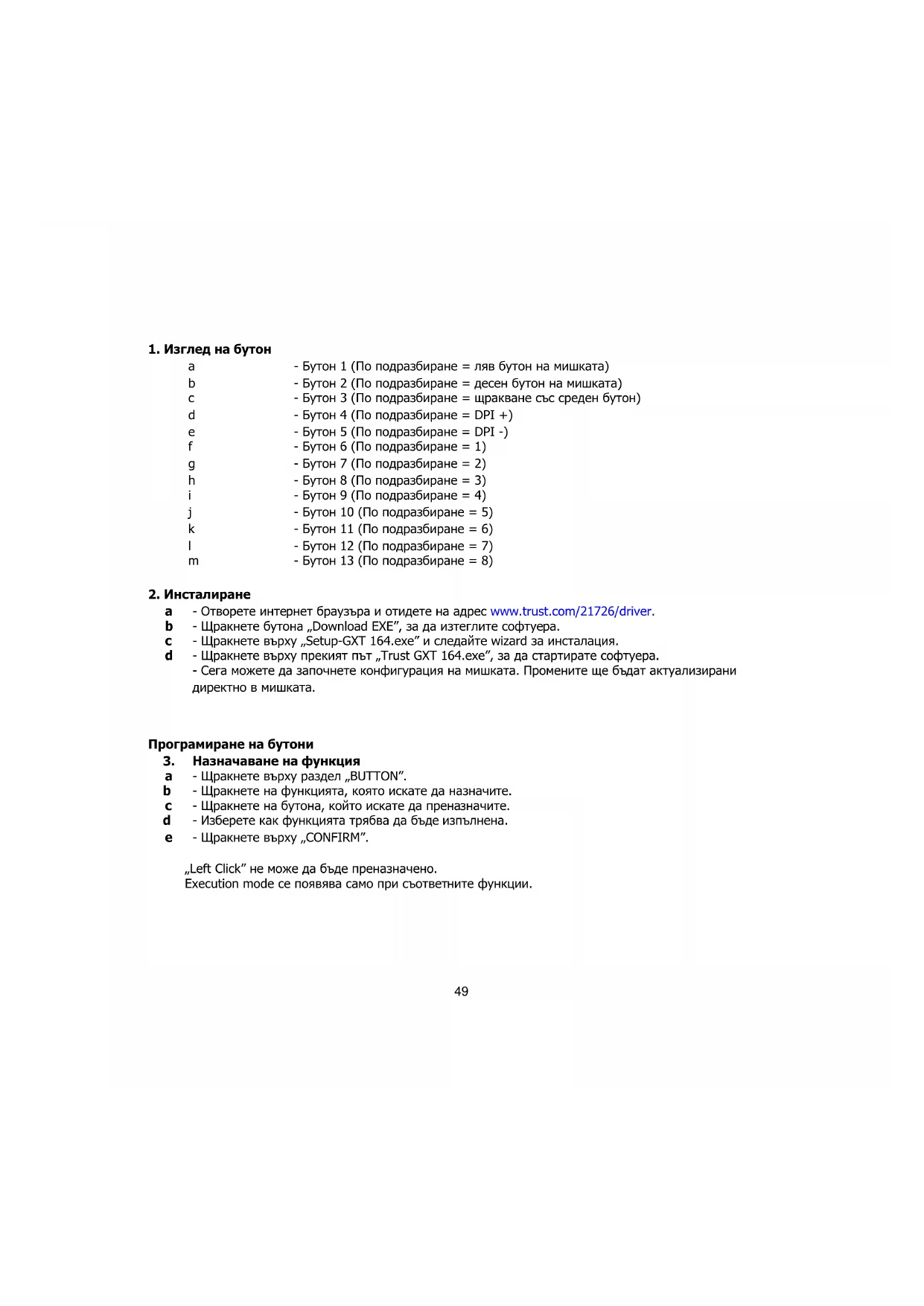 - Отворете интернет браузъра и отидете на адрес www.trust.com/21726/driver. - Щракнете бутона „Download EXE”, за да изтеглите софтуера. - Щракнете върху „Setup-GXT 164.exe” и следайте wizard за инсталация. - Щракнете върху прекият път „Trust GXT 164.exe”, за да стартирате софтуера. - Сега можете да започнете конфигурация на мишката. Промените ще бъдат актуализирани директно в мишката.