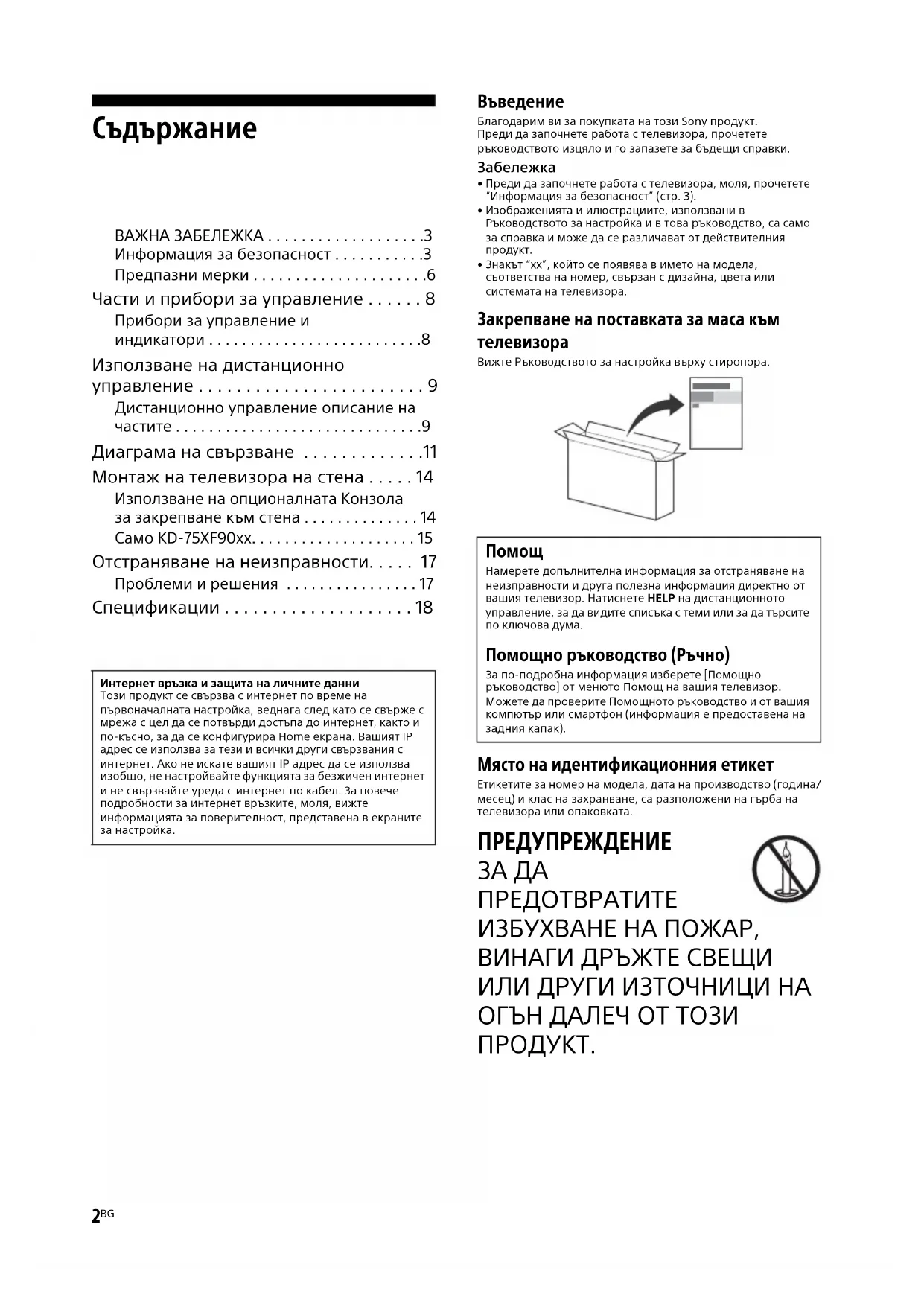 Интернет връзка и защита на личните данниТози продукт се свързва с интернет по време на първоначалната настройка, веднага след като се свърже с мрежа с цел да се потвърди достъпа до интернет, както и по-късно, за да се конфигурира Home екранa. Вашият IP адрес се използва за тези и всички други свързвания с интернет. Ако не искате вашият IP адрес да се използва изобщо, не настройвайте функцията за безжичен интернет и не свързвайте уреда с интернет по кабел. За повече подробности за интернет връзките, моля, вижте информацията за поверителност, представена в екраните за настройка. Намерете допълнителна информация за отстраняване на неизправности и друга полезна информация директно от вашия телевизор. Натиснете HELP на дистанционното управление, за да видите списъка с теми или за да търсите по ключова дума. Помощно ръководство (Ръчно) За по-подробна информация изберете [Помощно ръководство] от менюто Помощ на вашия телевизор. Можете да проверите Помощното ръководство и от вашия компютър или смартфон (информация е предоставена на задния капак).C:\Users\CHAILING_2\Desktop\CU\EU-2\17BG\4733119112_17BG.fm master page: Right KD-75XF90xx / 65XF90xx / 55XF90xx / 49XF90xx 4-733-119-11(2)