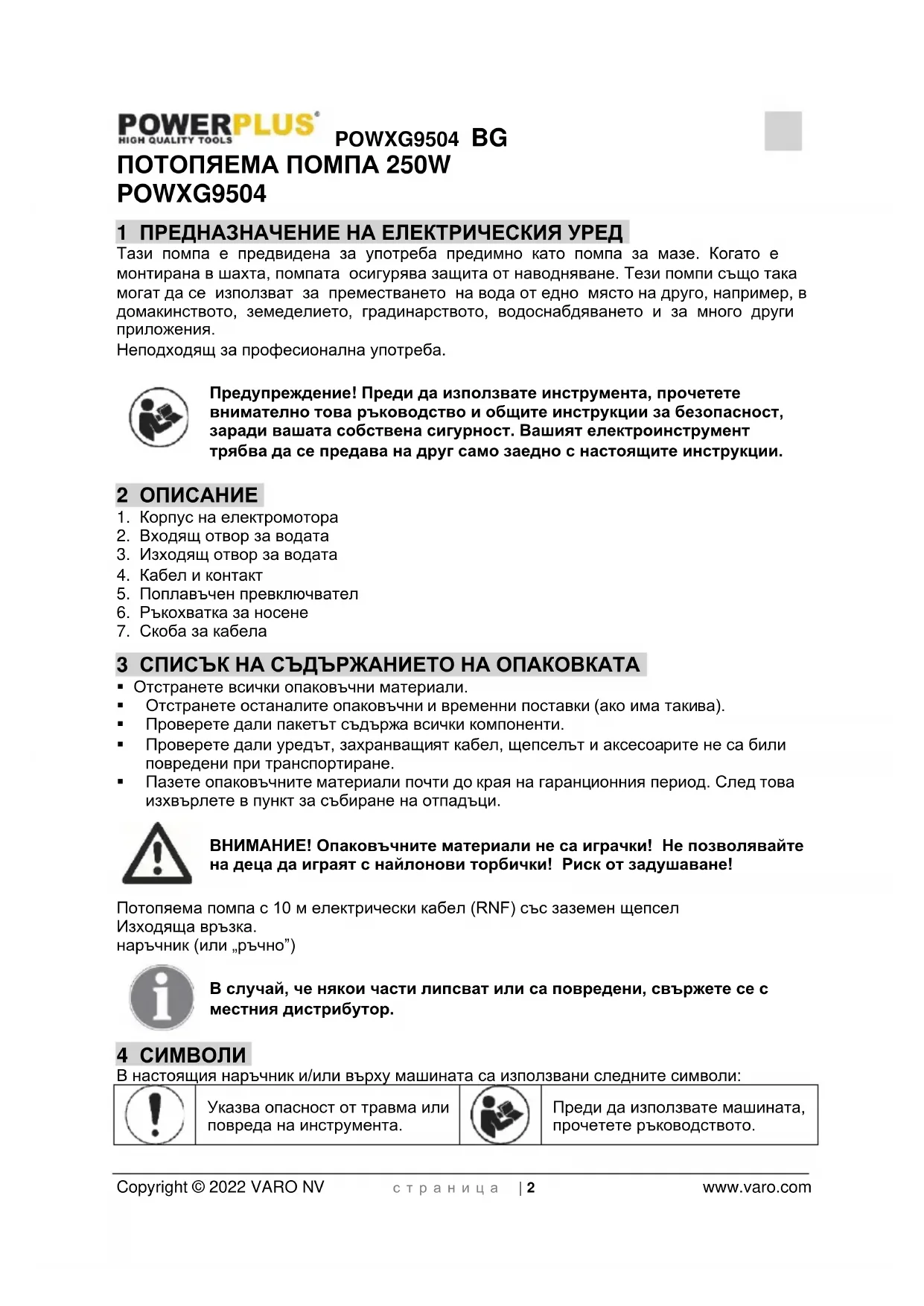 - 16 ДЕКЛАРАЦИЯ ЗА СЪОТВЕТСТВИЕ POWXG9504 BG Copyright © 2022 VARO NV с т р а н и ц а | 2 www.varo.com ПОТОПЯЕМА ПОМПА 250W POWXG9504 1 ПРЕДНАЗНАЧЕНИЕ НА ЕЛЕКТРИЧЕСКИЯ УРЕД Тази помпа е предвидена за употреба предимно като помпа за мазе. Когато е монтирана в шахта, помпата осигурява защита от наводняване. Тези помпи също така могат да се използват за преместването на вода от едно място на друго, например, в домакинството, земеделието, градинарството, водоснабдяването и за много други приложения. Неподходящ за професионална употреба. Предупреждение! Преди да използвате инструмента, прочетете внимателно това ръководство и общите инструкции за безопасност, заради вашата собствена сигурност. Вашият електроинструмент трябва да се предава на друг само заедно с настоящите инструкции. 2 ОПИСАНИЕ p. 8