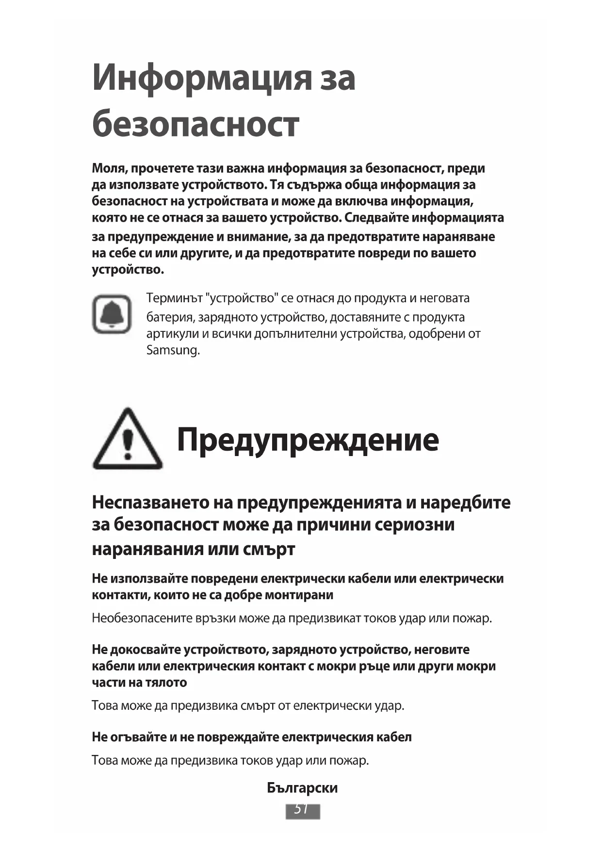 Информация за безопасност Моля, прочетете тази важна информация за безопасност, преди да използвате устройството. Тя съдържа обща информация за безопасност на устройствата и може да включва информация, която не се отнася за вашето устройство. Следвайте информацията за предупреждение и внимание, за да предотвратите нараняване на себе си или другите, и да предотвратите повреди по вашето устройство.Терминът "устройство" се отнася до продукта и неговата батерия, зарядното устройство, доставяните с продукта артикули и всички допълнителни устройства, одобрени от Samsung. Предупреждение Неспазването на предупрежденията и наредбите за безопасност може да причини сериозни наранявания или смърт Не използвайте повредени електрически кабели или електрически контакти, които не са добре монтираниНеобезопасените връзки може да предизвикат токов удар или пожар.Не докосвайте устройството, зарядното устройство, неговите кабели или електрическия контакт с мокри ръце или други мокри части на тялотоТова може да предизвика смърт от електрически удар.Не огъвайте и не повреждайте електрическия кабелТова може да предизвика токов удар или пожар.Български