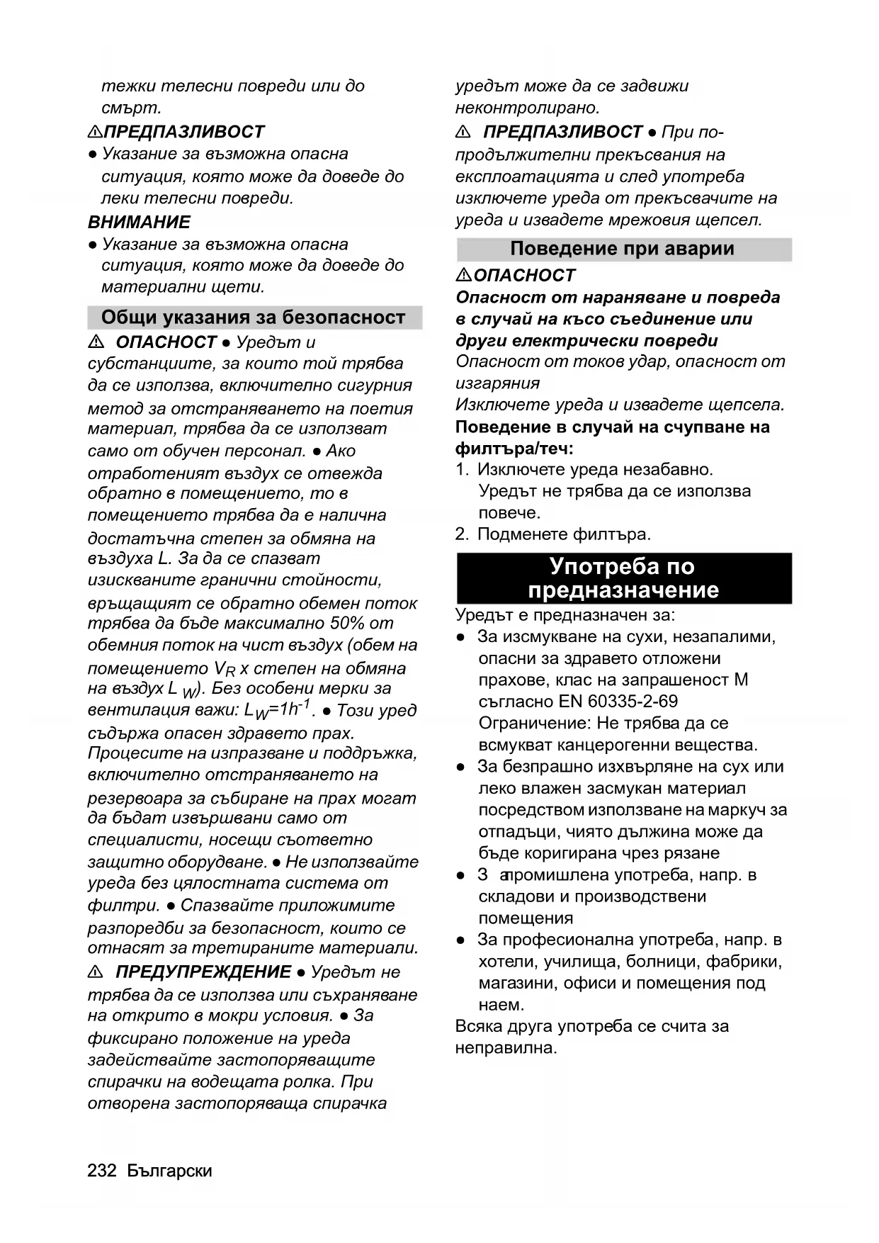 Употреба по предназначение Уредът е предназначен за: ●За изсмукване на сухи, незапалими, опасни за здравето отложени прахове, клас на запрашеност M съгласно EN 60335-2-69 Ограничение: Не трябва да се всмукват канцерогенни вещества. ●За безпрашно изхвърляне на сух или леко влажен засмукан материал посредством използване на маркуч за отпадъци, чиято дължина може да бъде коригирана чрез рязане