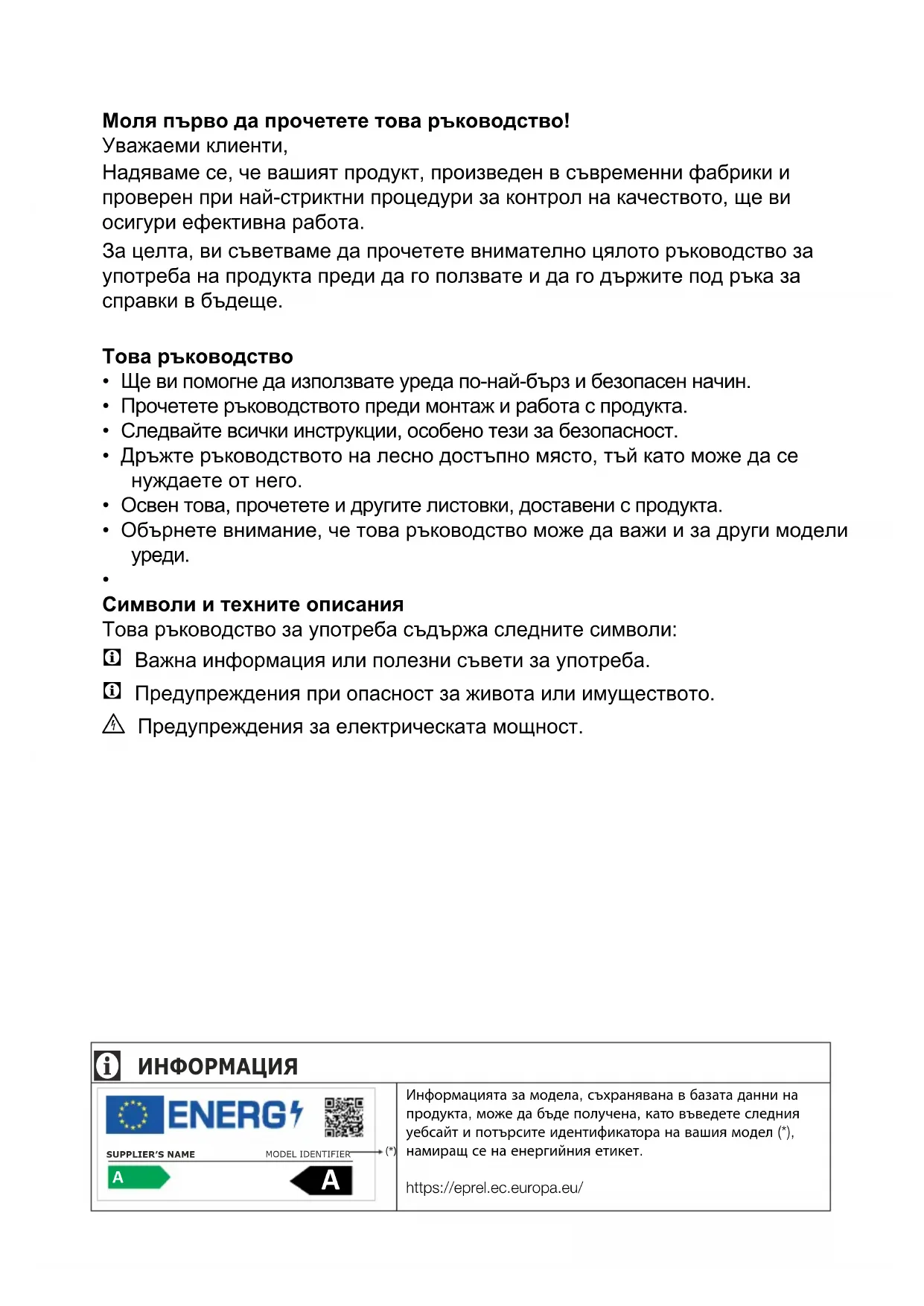 Информацията за модела, съхранявана в базата данни на продукта, може да бъде получена, като въведете следния уебсайт и потърсите идентификатора на вашия модел (*), намиращ се на енергийния етикет. https://eprel.ec.europa.eu/BG