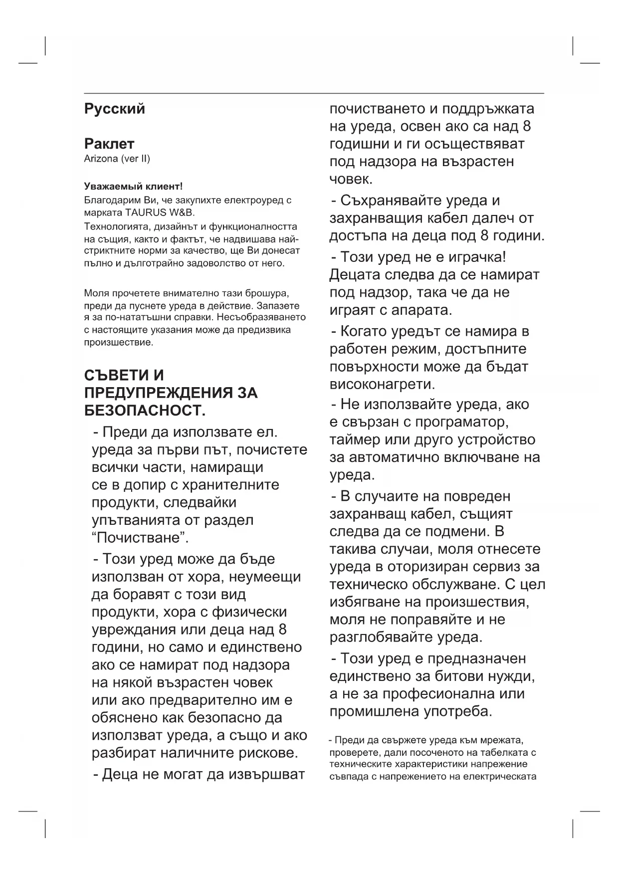 Arizona (ver II) Уважаемый клиент! Благодарим Ви, че закупихте електроуред с марката TAURUS W&B. Технологията, дизайнът и функционалността на същия, както и фактът, че надвишава най- стриктните норми за качество, ще Ви донесат пълно и дълготрайно задоволство от него. Моля прочетете внимателно тази брошура, преди да пуснете уреда в действие. Запазете я за по-нататъшни справки. Несъобразяването с настоящите указания може да предизвика произшествие.