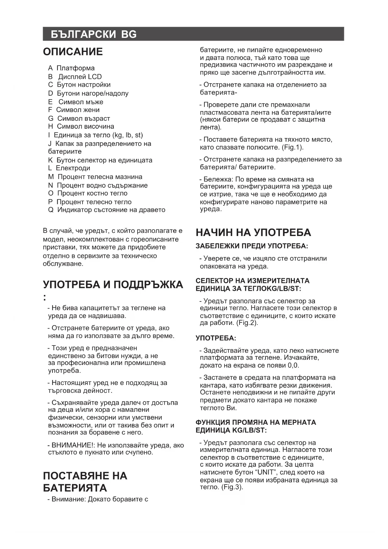 - Задействайте уреда, като леко натиснете платформата за теглене. Изчакайте, докато на екрана се появи 0,0. - Застанете в средата на платформата на кантара, като избягвате рeзки движения. Останете неподвижни и не пипайте други предмети докато кантара не покаже теглото Ви. ФУНКЦИЯ ПРОМЯНА НА МЕРНАТА ЕДИНИЦА KG/LB/ST: - Уредът разполага със селектор на измерителната единица. Нагласете този селектор в съответствие с единиците, с които искате да работи. За целта натиснете бутон “UNIT”, след което на екрана ще се появи избраната единица за тегло. (Fig.3).BG ПРОГРАМИРАНЕ НА ЛИЧНИТЕ