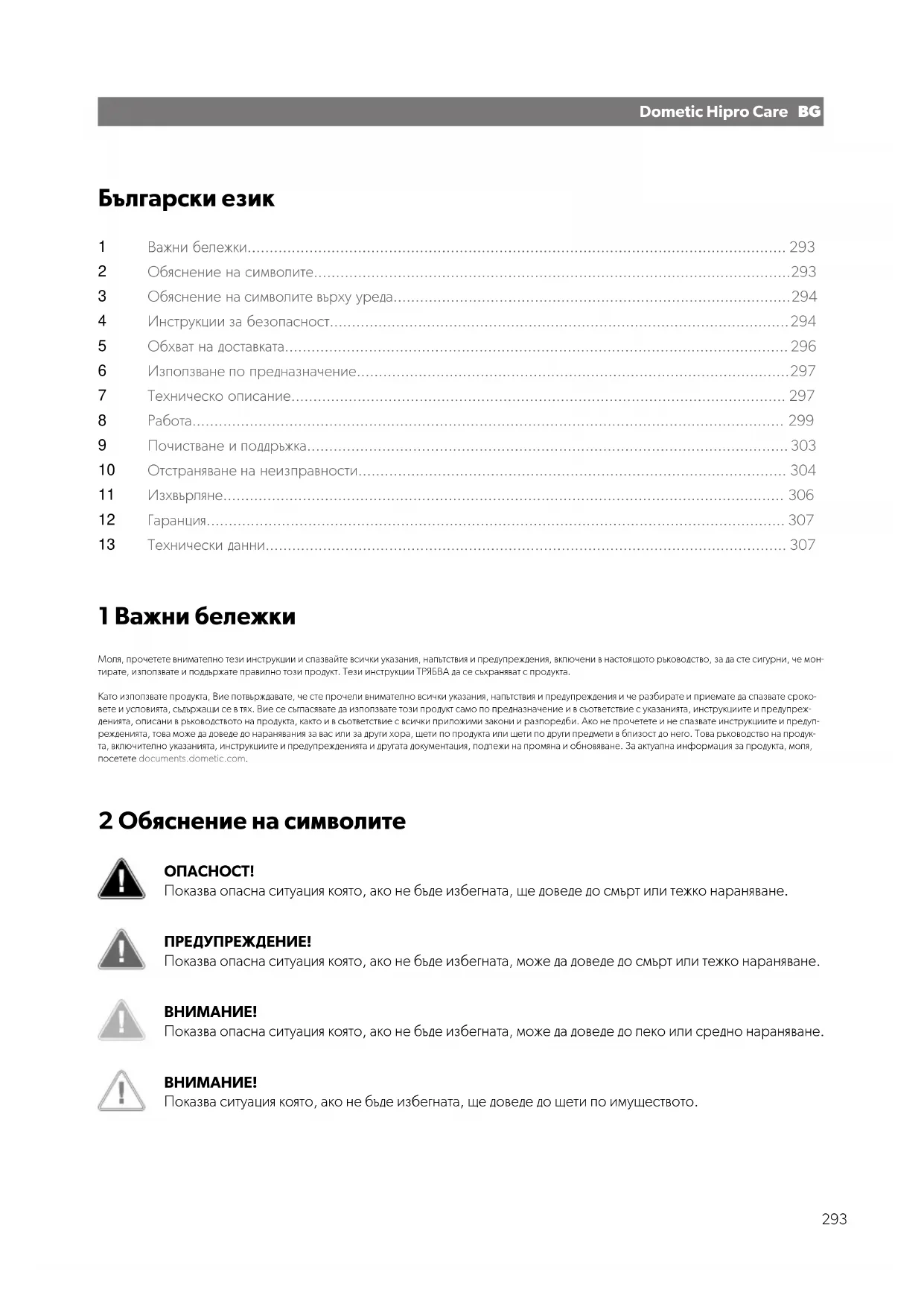 Показва ситуация която, ако небъде избегната, ще доведе до щети по имуществото. 293BGDometic Hipro Care УКАЗАНИЕ Допълнителна информация за боравенето спродукта. 3 Обяснение на символите върху уреда Опасност от пожар/запалими материали 4 Инструкции за безопасност Обща безопасност ПРЕДУПРЕЖДЕНИЕ! Опасност отелектрически удар