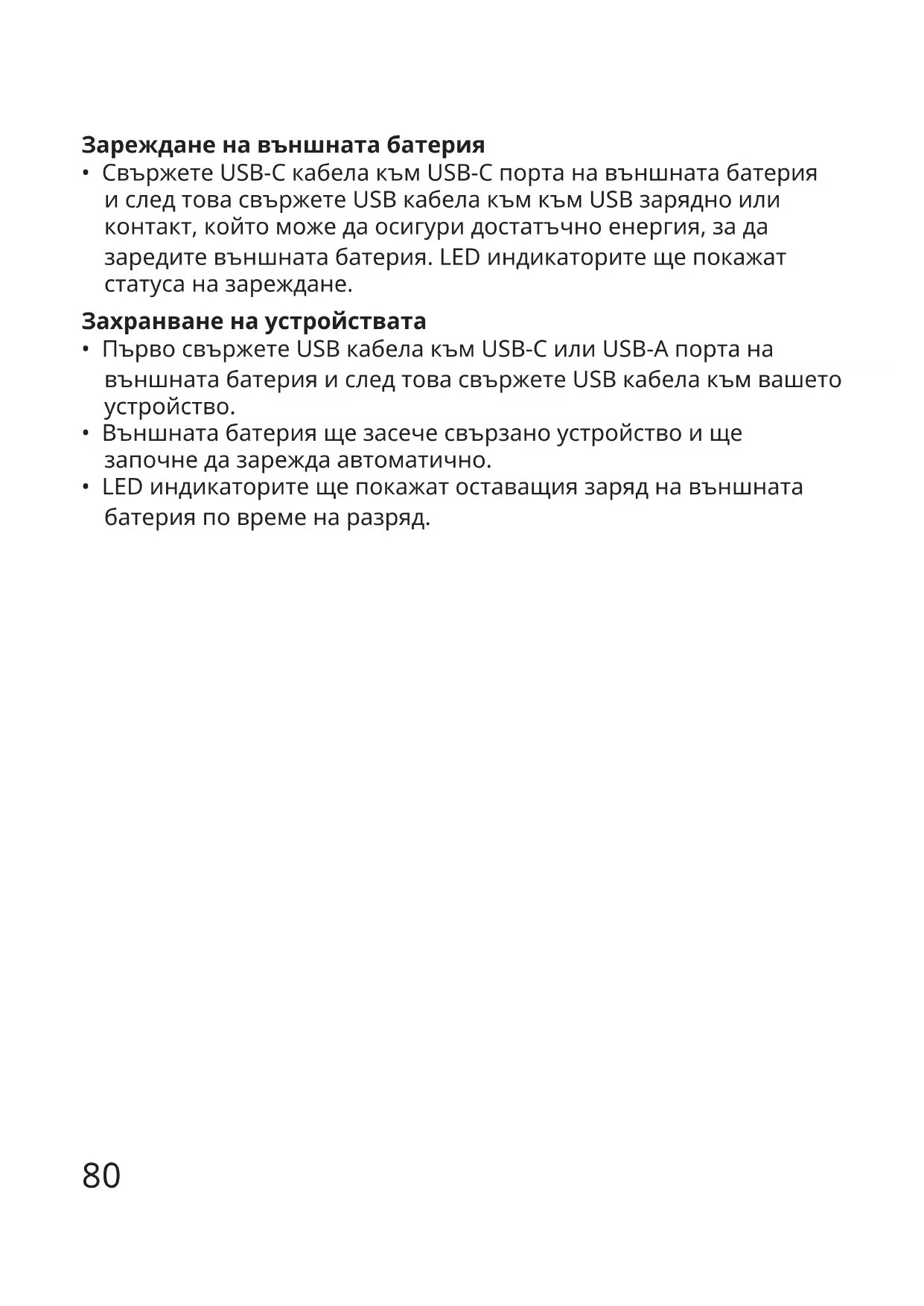 - Свържете USB-C кабела към USB-C порта на външната батерия и след това свържете USB кабела към към USB зарядно или контакт, който може да осигури достатъчно енергия, за да заредите външната батерия. LED индикаторите ще покажат статуса на зареждане. Захранваненаустройствата