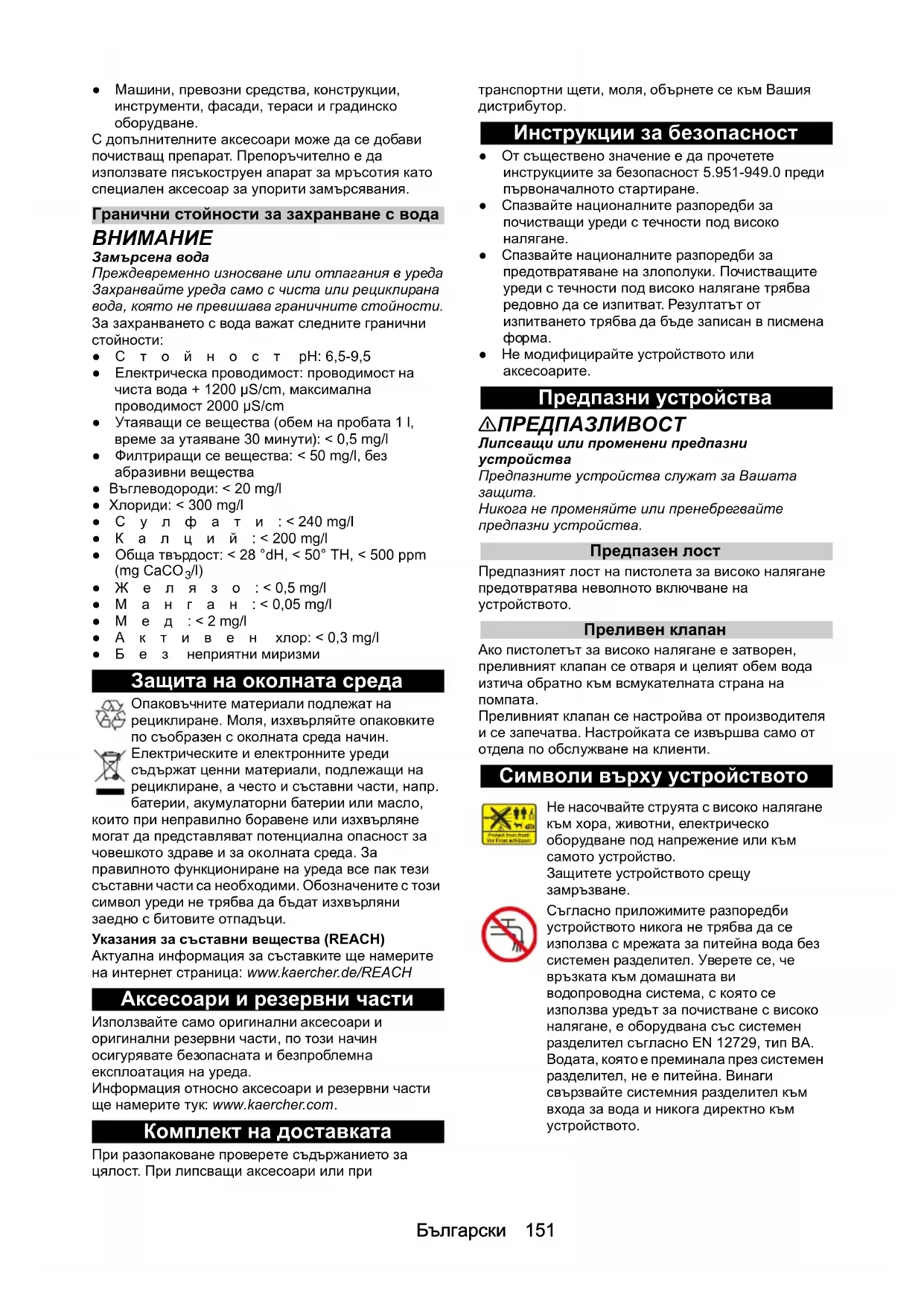 /l) ●Желязо: < 0,5 mg/l ●Манган: < 0,05 mg/l ●Мед: < 2 mg/l ●Активен хлор: < 0,3 mg/l ●Без неприятни миризми Защита на околната среда Опаковъчните материали подлежат на рециклиране. Моля, изхвърляйте опаковките по съобразен с околната среда начин. Електрическите и електронните уреди съдържат ценни материали, подлежащи на рециклиране, а често и съставни части, напр. батерии, акумулаторни батерии или масло, които при неправилно боравене или изхвърляне могат да представляват потенциална опасност за човешкото здраве и за ок олната среда. За правилното функциониране на уреда все пак тези съставни части са необходими. Обозначените с този символ уреди не трябва да бъдат изхвърляни заедно с битовите отпадъци. Указания за съставни вещества (REACH) Актуална информация за съставките ще намерите на интернет страница: www.kaercher.de/REACH Аксесоари и резервни части Използвайте само оригинални аксесоари и оригинални резервни части, по този начин осигурявате безопасната и безпроблемна експлоатация на уреда. Информация относно аксесоари и резервни части ще намерите тук: www.kaercher.com. Комплект на доставката При разопаковане проверете съдържанието за цялост. При липсващи аксесоари или при транспортни щети, моля, обърнете се към Вашия дистрибутор. Инструкции за безопасност ●От съществено значение е да прочетете инструкциите за безопасност 5.951-949.0 преди първоначалното стартиране. ●Спазвайте националните разпоредби за почистващи уреди с течности под високо
