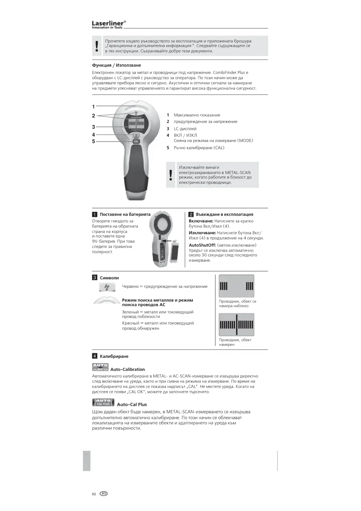 Електронен локатор за метал и проводници под напрежение. CombiFinder Plus е оборудван с LC-дисплей с ръководство за оператора. По този начин може да управлявате прибора лесно и сигурно. Акустични и оптични сигнали за намиране на предмети улесняват управлението и гарантират висока функционална сигурност. Auto-Calibration Автоматичното калибриране в METAL- и AC-SCAN-измерване се извършва директно след включване на уреда, както и при смяна на режима на измерване. По време на калибрирането на дисплея се показва надписът „CAL“. Не местете уреда. Когато на дисплея се появи „CAL OK“, можете да започнете търсенето. Auto-Cal Plus Щом даден обект бъде намерен, в METAL-SCAN-измерването се извършва допълнително автоматично калибриране. По този начин се облекчават локализацията на измерваните обекти и адаптирането на уреда към различни повърхности. Калибриране Режим поиска металлов и режим поиска проводов AC Зеленый = металл или токоведущий провод поблизости Красный = металл или токоведущий провод обнаружен Прочетете изцяло ръководството за експлоатация и приложената брошура „Гаранционна и допълнителна информация “. Следвайте съдържащите се в тях инструкции. Съхранявайте добре тези документи.