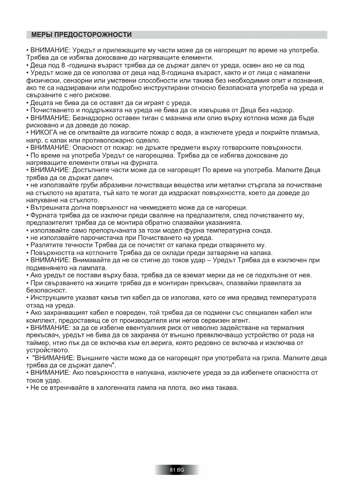 - Не се втренчвайте в халогенната лампа на плота, ако има такава. МЕРЫ ПРЕДОСТОРОЖНОСТИ 81 BGНие непрекъснато се стремим да подобрим качеството на продуктите и да ги модифицираме, за да се включат най-новите технически подобрения. Уреда е в съответствие с европейските директиви 73/23/ЕИО и 89/336/ЕИО, заменена от 2006/95/ЕО и 2004/108/ЕО, и последващи изменения.