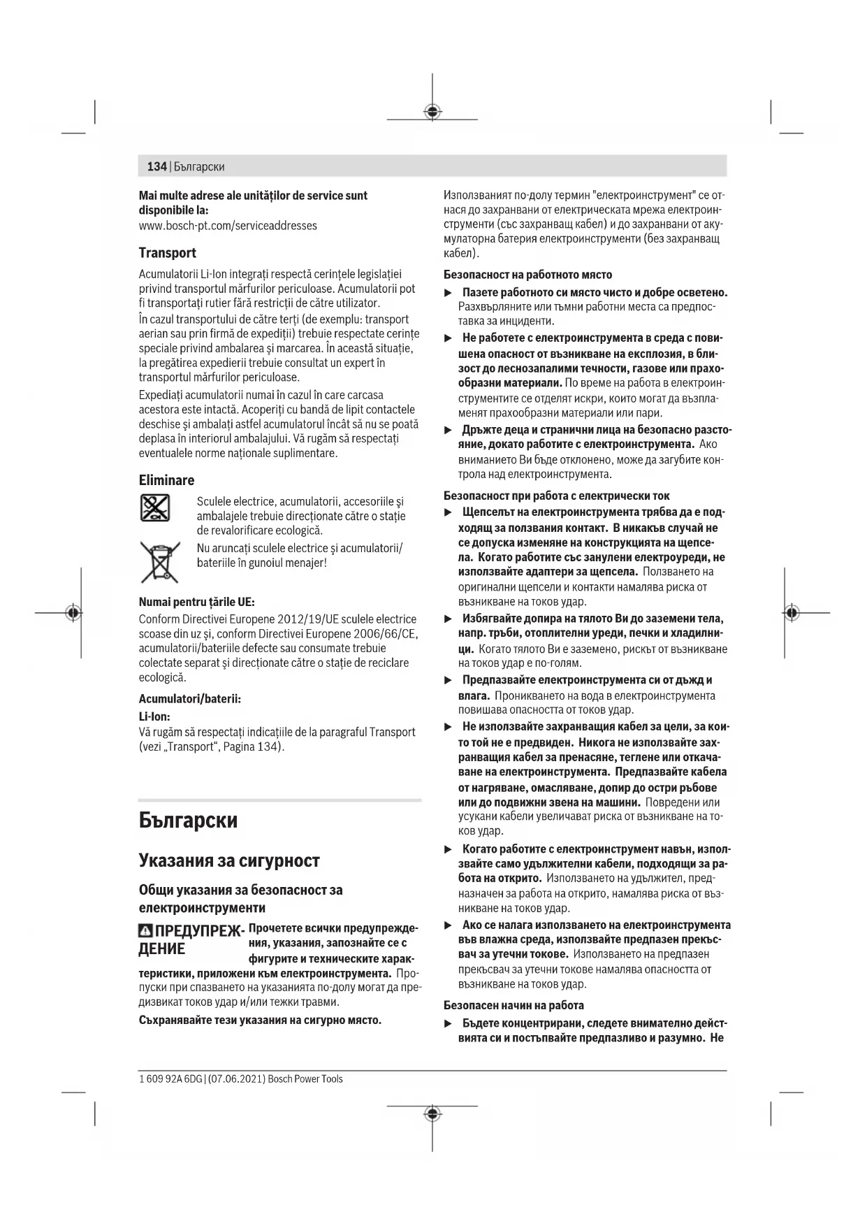 Електроинструментите, акумулаторните ба- терии и допълнителните приспособления трябва да бъдат предавани за оползотворя- ване на съдържащите се в тях суровини. Не изхвърляйте електроинструменти и аку- мулаторни или обикновени батерии при би- товите отпадъци! Само за страни отЕС: Съгласно европейска директива 2012/19/EС електроу- редите, които не могат да се ползват повече, а съгласно 1 609 92A 6DG | (07.06.2021) Bosch Power ToolsМакедонски | 141 европейска директива 2006/66/EО повредени или изха- бени обикновени или акумулаторни батерии трябва да се събират и предава за оползотворяване на съдържащите се в тях суровини. Акумулаторни или обикновени батерии: Литиево-йонни: Моля, спазвайте указанията в раздела Транспортиране (вж. „Транспортиране“, Страница140).