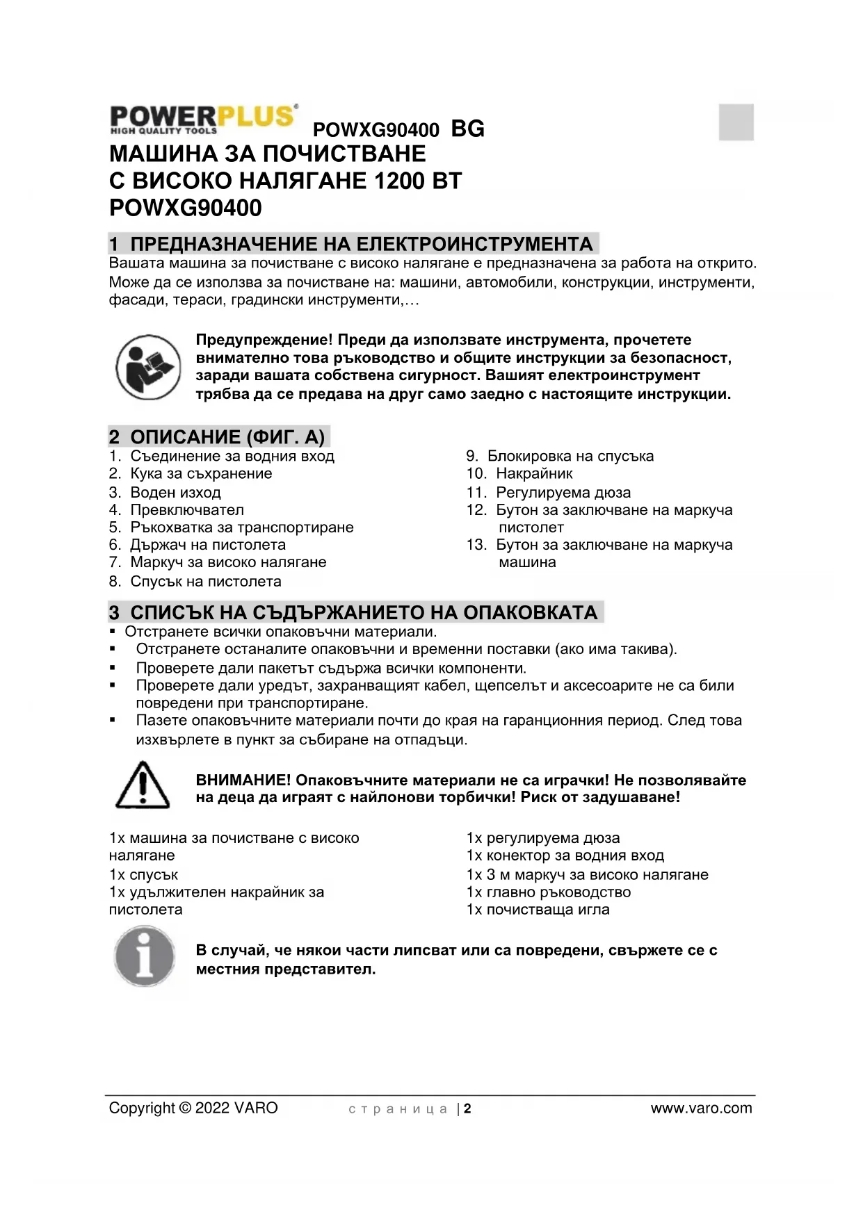 - Почиствайте дюзите. Всички ремонти трябва да бъдат извършвани в упълномощен сервиз с оригинални резервни части.POWXG90400 BG Copyright © 2022 VARO с т р а н и ц а | 8 www.varo.com