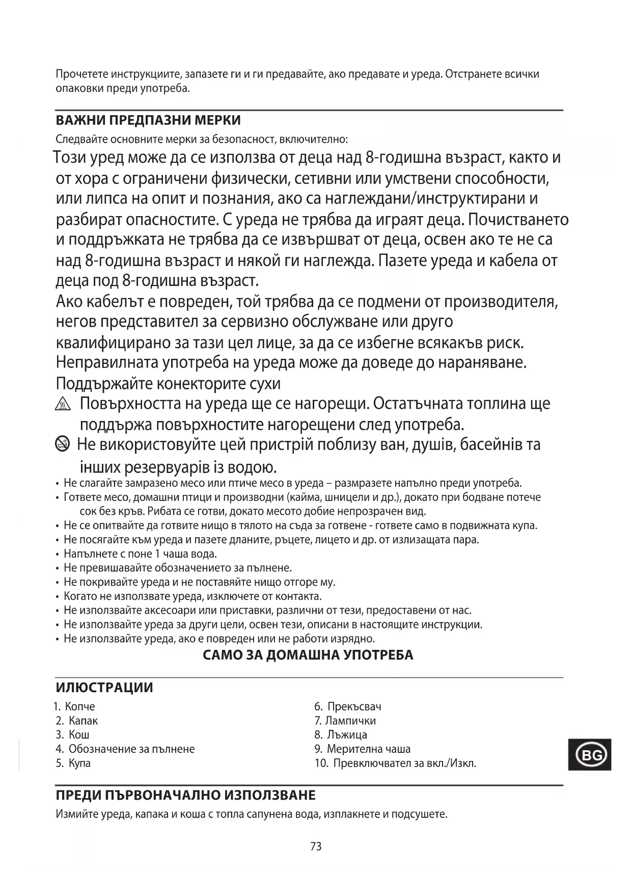 Pentru a evita problemele de mediu și de sănătate cauzate de substanțele periculoase, aparatele și bateriile reîncărcabile și cele obișnuite marcate cu unul dintre aceste simboluri, nu trebuie eliminate împreună cu deșeurile municipale nesortate. Eliminați întotdeauna produsele electrice și electronice și, după caz, bateriile reîncărcabile și cele obișnuite, la un punct de reciclare/colectare corespunzător.73 Прочетете инструкциите, запазете ги и ги предавайте, ако предавате и уреда. Отстранете всички опаковки преди употреба. ВАЖНИ ПРЕДПАЗНИ МЕРКИ Следвайте основните мерки за безопасност, включително: Този уред може да се използва от деца над 8-годишна възраст, както и от хора с ограничени физически, сетивни или умствени способности, или липса на опит и познания, ако са наглеждани/инструктирани и разбират опасностите. С уреда не трябва да играят деца. Почистването и поддръжката не трябва да се извършват от деца, освен ако те не са над 8-годишна възраст и някой ги наглежда. Пазете уреда и кабела от деца под 8-годишна възраст. Ако кабелът е повреден, той трябва да се подмени от производителя, негов представител за сервизно обслужване или друго квалифицирано за тази цел лице, за да се избегне всякакъв риск. Неправилната употреба на уреда може да доведе до нараняване. Поддържайте конекторите сухи