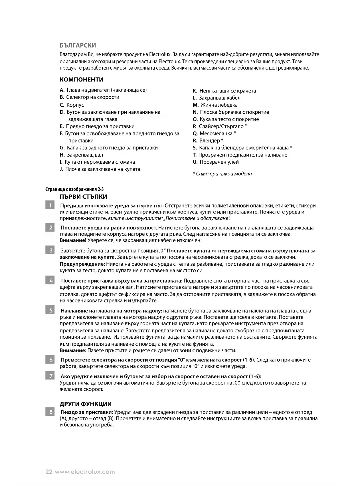 Внимание: Изключете уреда и извадете щепсела му от контакта преди да поставяте принадлежности. 16 Завъртете блендера по посока на часовниковата стрелка, докато щракне. Дръжката на блендера трябва да сочи към задната част на кухненския робот, когато е правилно поставен. Поставете капака на блендера и мерителната купа. Включете щепсела в захранването. С бутона за скорост задайте нужната скорост (препоръчителна скорост: 6), миксирайте до получаване на желаната консистенция. Внимание: Никога не пускайте блендера без да има сложени съставки в него. ГРИЖИ И ПОЧИСТВАНЕ 17 Изключете уреда. Телената бъркалка, ножът за месо* и ножът на блендера/чопъра* трябва да се мият само на ръка с топла сапунена вода. Купата, плоската бъркалка и бъркалката за тесто могат да се мият в миялна машина. Ако използвате съдомиялна машина, поставяйте части от уреда само на горния рафт. Внимание! Ножовете и приставките са много остри и могат да причинят нараняване. Предупреждение! Никога не потапяйте във вода или друга течност корпуса, кабела или щепсела. Подсушавайте всяка част много добре преди употреба. 18 Почистване на блендера*: Завъртете блендера обратно на часовниковата стрелка и го извадете. Махнете и капака. Изсипете сместа от блендера. Добавете капка препарат за миене на съдове и един литър топла вода. Поставете отново блендера върху уреда. Пуснете кухненския робот на скорост 6 за половин минута, след което излейте водата. Изплакнете блендера и го оставете да съхне. Внимание! Ножовете и приставките са много остри и могат да причинят нараняване.24 www.electrolux.com 19 Корпусът трябва да се почиства само с влажна и мека кърпа и да се подсушава с кърпа. Забележка: Не използвайте абразивни препарати или груби кухненски гъби при почистването на повърхността на уреда ви. Насладете се на своя нов продукт от Electrolux! УКАЗАНИЯ ЗА БЕЗОПАСНОСТ Прочетете следните инструкции внимателно преди за използвате уреда за първи път.