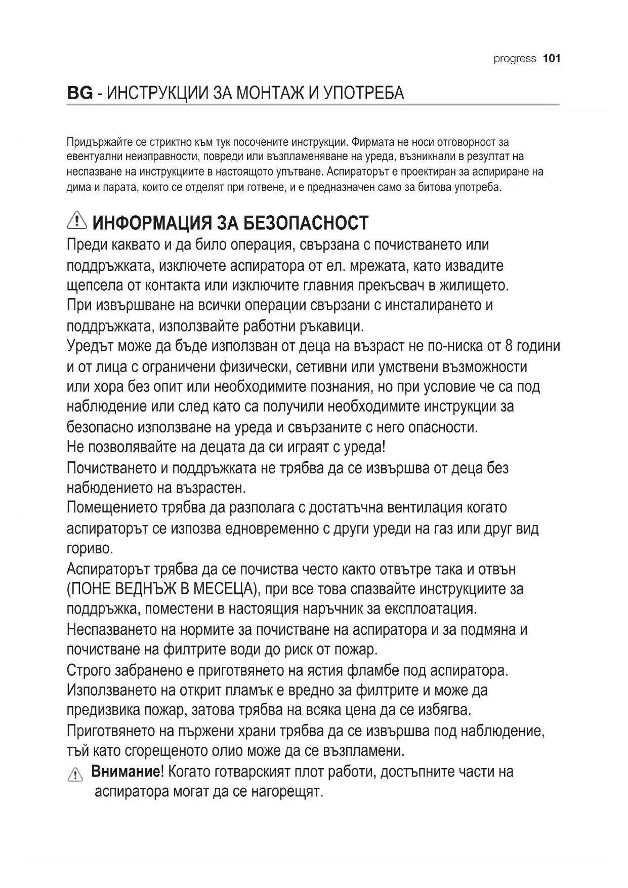 Аспираторът трябва да се почиства често както отвътре така и отвън (ПОНЕ ВЕДНЪЖ В МЕСЕЦА), при все това спазвайте инструкциите за поддръжка, поместени в настоящия наръчник за експлоатация. Неспазването на нормите за почистване на аспиратора и за подмяна и почистване на филтрите води до риск от пожар. Строго забранено е приготвянето на ястия фламбе под аспиратора. Използването на открит пламък е вредно за филтрите и може да предизвика пожар, затова трябва на всяка цена да се избягва. Приготвянето на пържени храни трябва да се извършва под наблюдение, тъй като сгорещеното олио може да се възпламени. Внимание! Когато готварският плот работи, достъпните части на аспиратора могат да се нагорещят.102 progress Инструкции за безопасност За да подмените лампите, използвайте само тези, които са посочени в раздел „Поддръжка/ подмяна на лампите“, както е посочено в настоящия наръчник за експлоатация. Внимание! Не свързвайте уреда към ел. мрежата докато не сте приключили окончателно с монтажа. Що се отнася до техническите размери и мерките за безопасност, които трябва да предприемете за отвеждането на димните газове навън, Ви препоръчваме да се придържате стриктно към правилата, предвидени в регламентите на компетентните местни власти. Аспирираният въздух не трябва да се насочва към тръбопроводите, които се използват за отвеждане на димните газове, отделящи се при използването на уреди работещи с газ или друг вид гориво. Не използвайте и не оставяйте аспиратора без правилно монтирани лампички поради евентуален риск от токов удар. Никога не използвайте аспиратора без правилно монтирана решетка! Аспираторът не трябва НИКОГА да се използва като опорен плот освен ако това не е специално