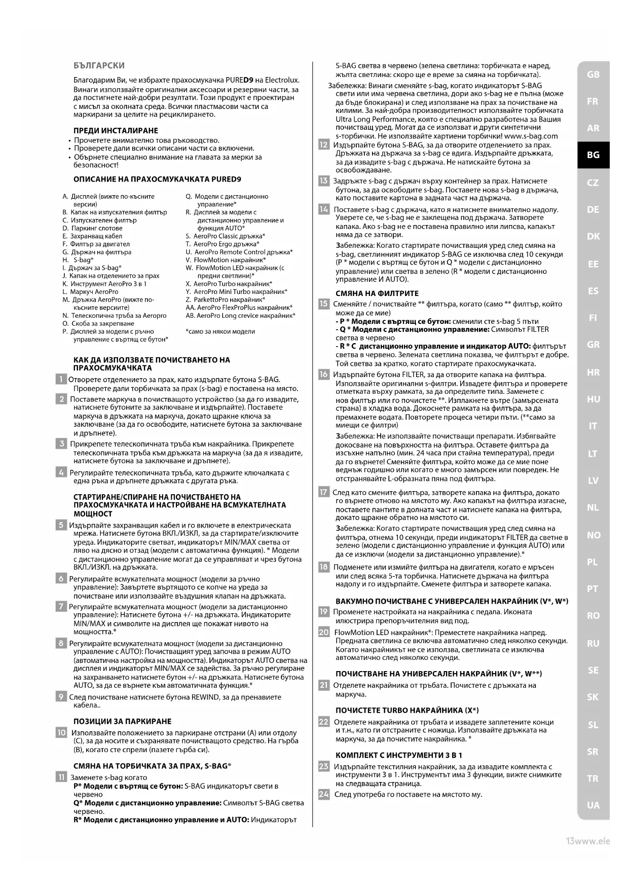 Благодарим Ви, че избрахте прахосмукачка PURED9 на Electrolux. Винаги използвайте оригинални аксесоари и резервни части, за да постигнете най-добри резултати. Този продукт е проектиран с мисъл за околната среда. Всички пластмасови части са маркирани за целите на рециклирането.