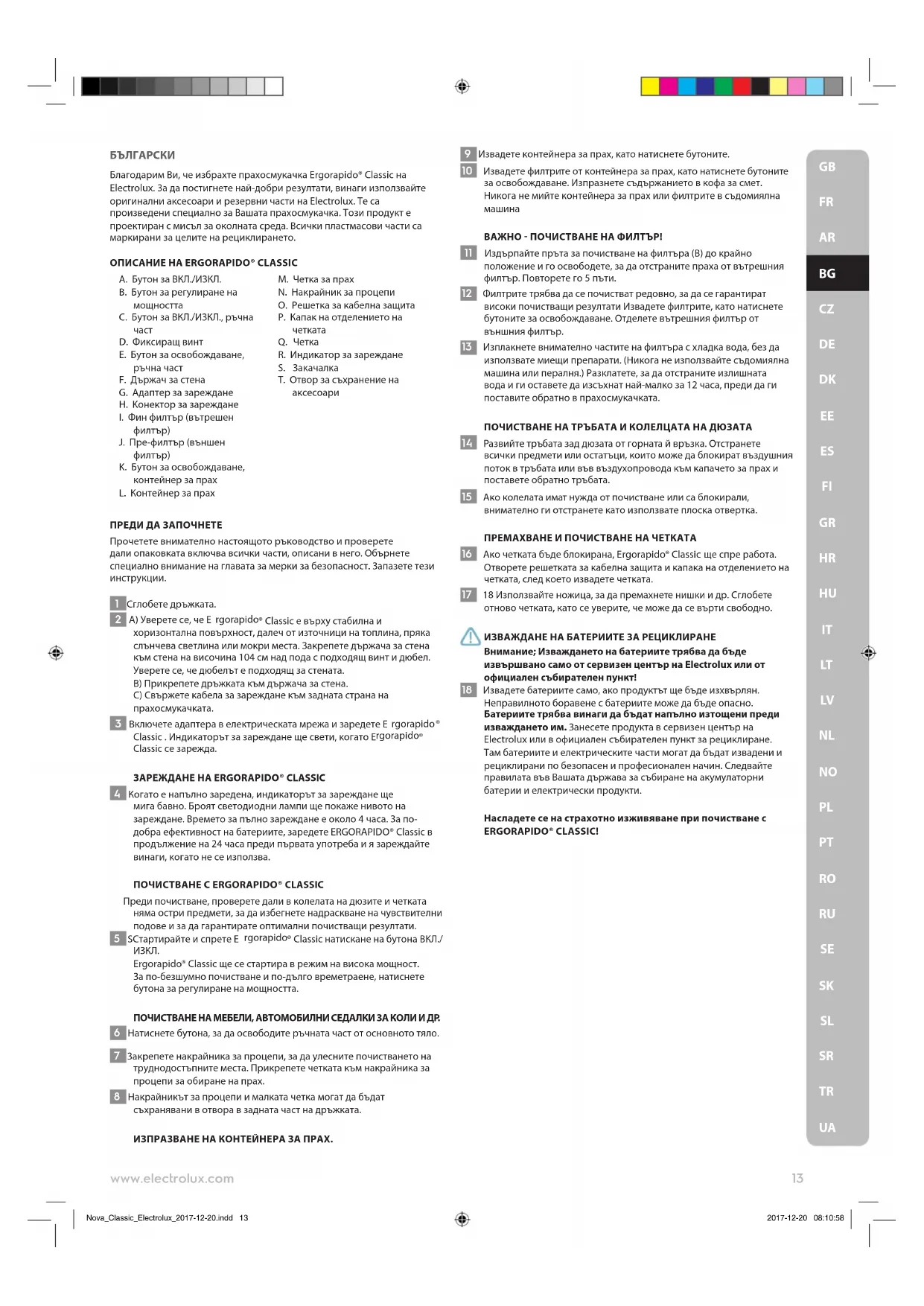 Nova_Classic_Electrolux_2017-12-20.indd 12 2017-12-20 08:10:58БЪЛГАРСКИ Благодарим Ви, че избрахте прахосмукачка Ergorapido® Classic на Electrolux. За да постигнете най-добри резултати, винаги използвайте оригинални аксесоари и резервни части на Electrolux. Те са произведени специално за Вашата прахосмукачка. Този продукт е проектиран с мисъл за околната среда. Всички пластмасови части са маркирани за целите на рециклирането. ОПИСАНИЕ НА ERGORAPIDO® CLASSIC A. Бутон за ВКЛ./ИЗКЛ. B. Бутон за регулиране на