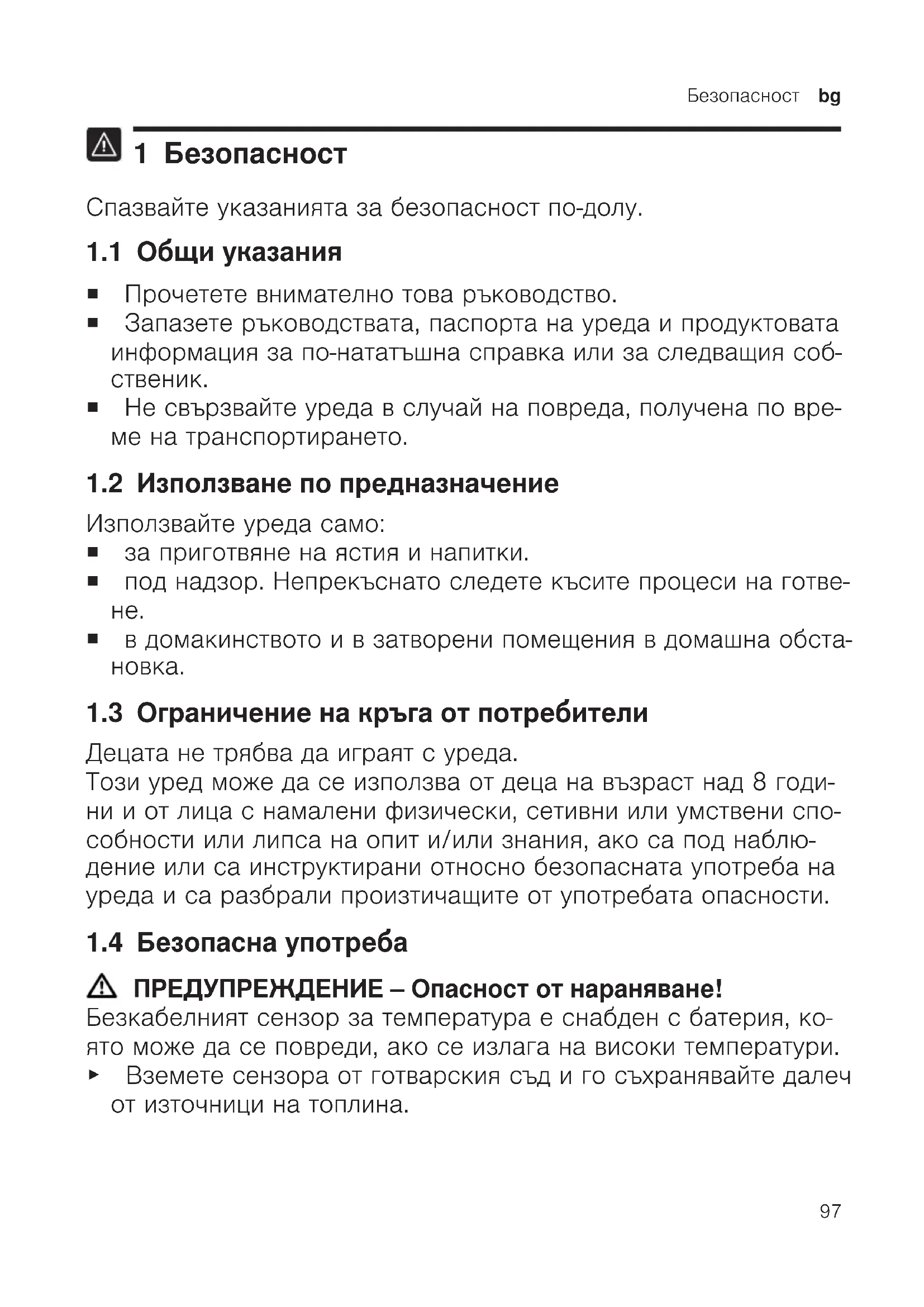 1.3 Ограничение на кръга от потребители Децата не трябва да играят с уреда. Този уред може да се използва от деца на възраст над 8 годи- ни и от лица с намалени физически, сетивни или умствени спо- собности или липса на опит и/или знания, ако са под наблю- дение или са инструктирани относно безопасната употреба на уреда и са разбрали произтичащите от употребата опасности. 1.4 Безопасна употреба ПРЕДУПРЕЖДЕНИЕ‒Опасност от нараняване! Безкабелният сензор за температура е снабден с батерия, ко- ято може да се повреди, ако се излага на високи температури. ▶ Вземете сензора от готварския съд и го съхранявайте далеч от източници на топлина.bg Безопасност
