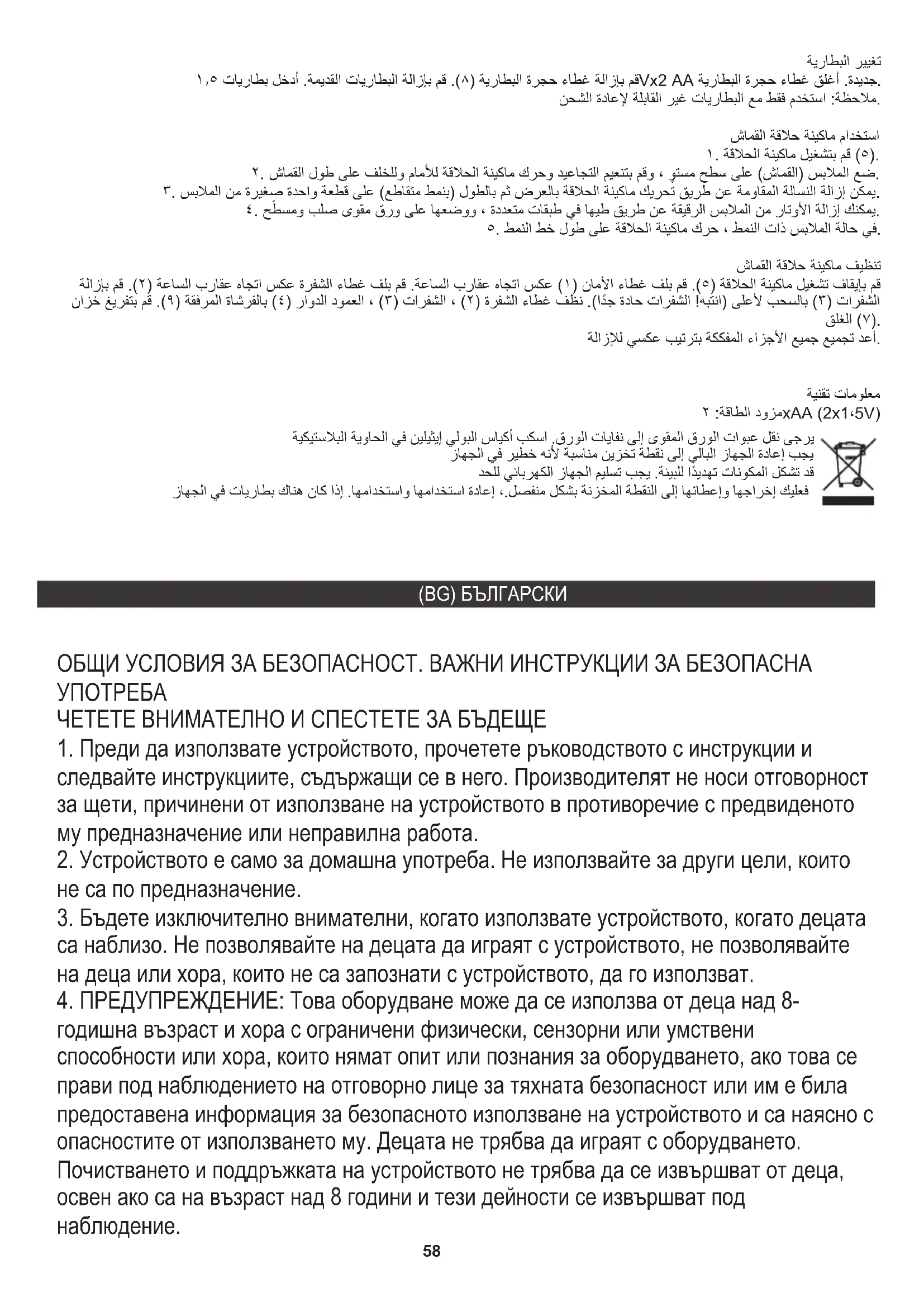 годишна възраст и хора с ограничени физически, сензорни или умствени способности или хора, които нямат опит или познания за оборудването, ако това се прави под наблюдението на отговорно лице за тяхната безопасност или им е била предоставена информация за безопасното използване на устройството и са наясно с опасностите от използването му. Децата не трябва да играят с оборудването. Почистването и поддръжката на устройството не трябва да се извършват от деца, освен ако са на възраст над 8 години и тези дейности се извършват под наблюдение. ЧЕТЕТЕ ВНИМАТЕЛНО И СПЕСТЕТЕ ЗА БЪДЕЩЕ