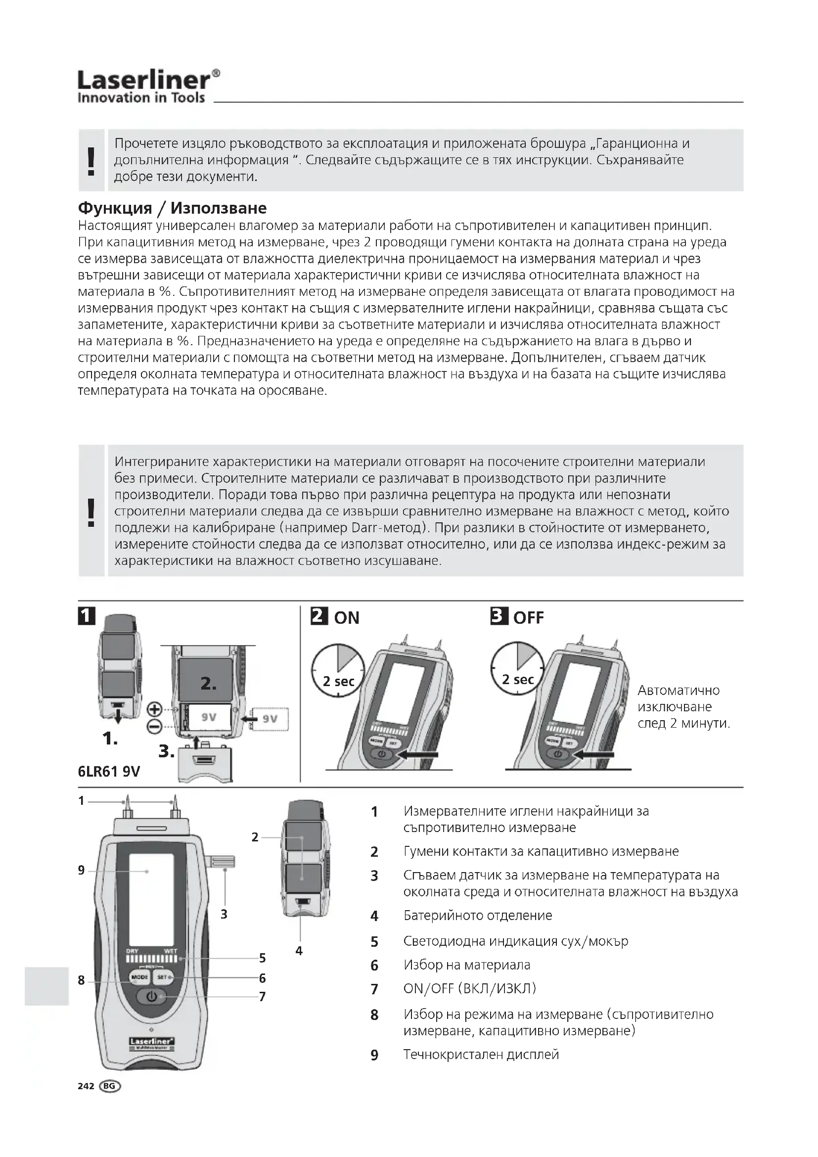 Функция / Използване Настоящият универсален влагомер за материали работи на съпротивителен и капацитивен принцип. При капацитивния метод на измерване, чрез 2 проводящи гумени контакта на долната страна на уреда се измерва зависещата от влажността диелектрична проницаемост на измервания материал и чрез вътрешни зависещи от материала характеристични криви се изчислява относителната влажност на материала в %. Съпротивителният метод на измерване определя зависещата от влагата проводимост на измервания продукт чрез контакт на същия с измервателните иглени накрайници, сравнява същата със запаметените, характеристични криви за съответните материали и изчислява относителната влажност на материала в %. Предназначението на уреда е определяне на съдържанието на влага в дърво и строителни материали с помощта на съответни метод на измерване. Допълнителен, сгъваем датчик определя околната температура и относителната влажност на въздуха и на базата на същите изчислява температурата на точката на оросяване.Прочетете изцяло ръководството за експлоатация и приложената брошура „Гаранционна и допълнителна информация “. Следвайте съдържащите се в тях инструкции. Съхранявайте добре тези документи. Автоматично изключване след 2 минути.Интегрираните характеристики на материали отговарят на посочените строителни материали без примеси. Строителните материали се различават в производството при различните производители. Поради това първо при различна рецептура на продукта или непознати строителни материали следва да се извърши сравнително измерване на влажност с метод, който подлежи на калибриране (например Darr-метод). При разлики в стойностите от измерването, измерените стойности следва да се използват относително, или да се използва индекс-режим за характеристики на влажност съответно изсушаване.
