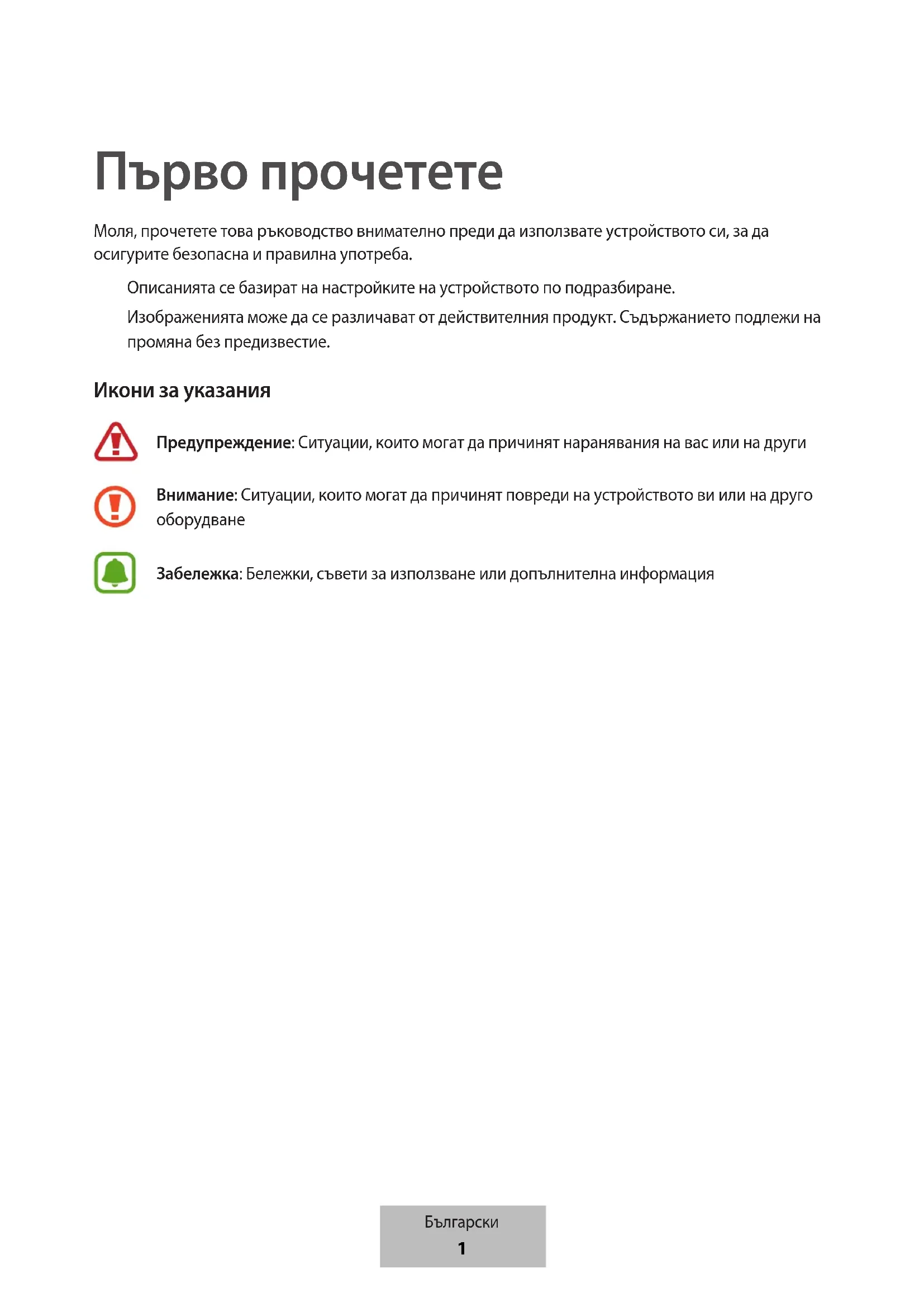 Изображенията може да се различават от действителния продукт. Съдържанието подлежи на промяна без предизвестие. Икони за указания Предупреждение: Ситуации, които могат да причинят наранявания на вас или на други Внимание: Ситуации, които могат да причинят повреди на устройството ви или на друго