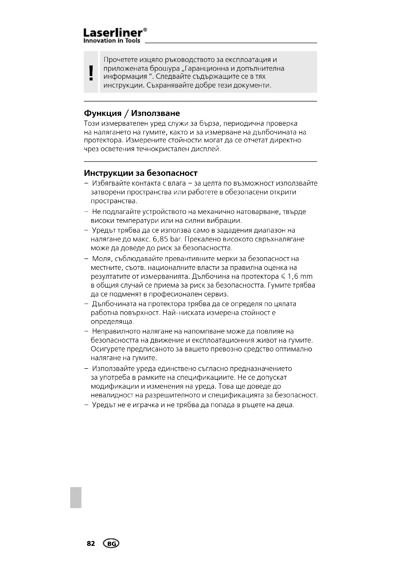 РЪКОВОДСТВО ЗА ПОТРЕБИТЕЛЯ TireCheck Laserliner